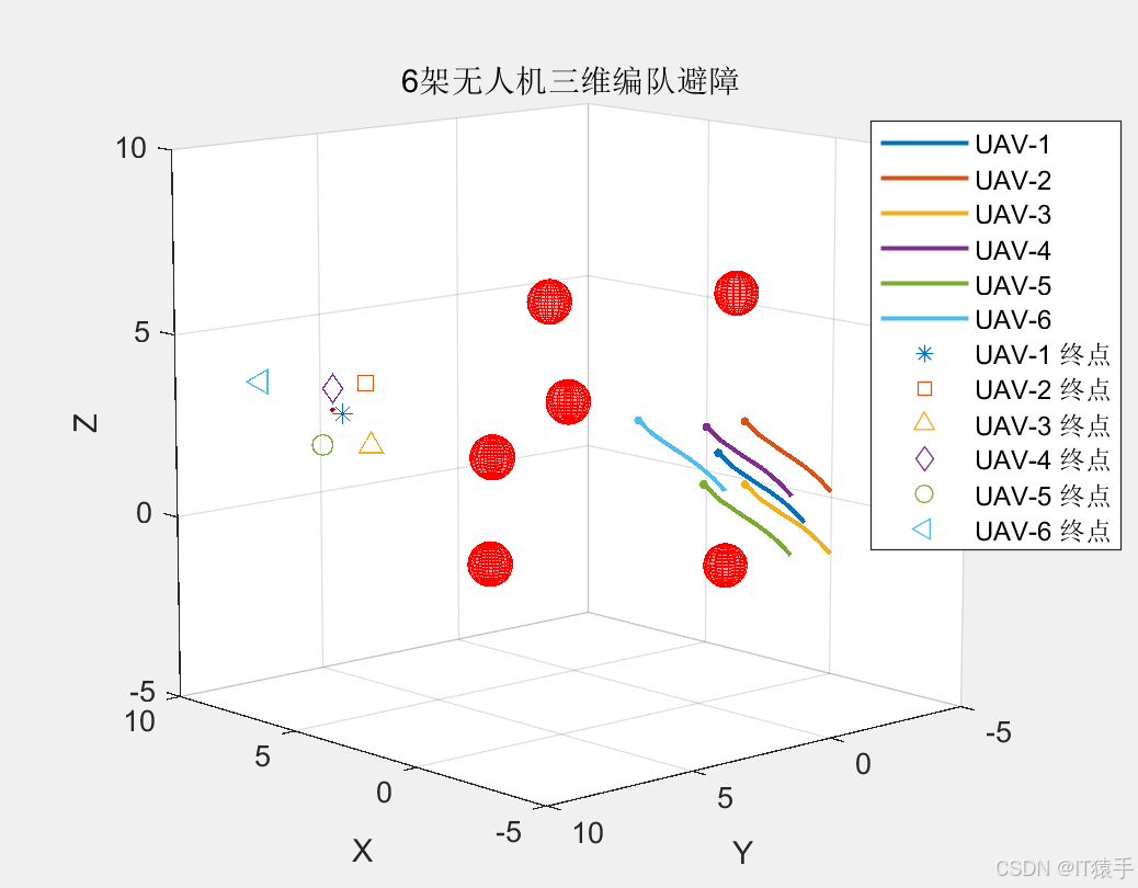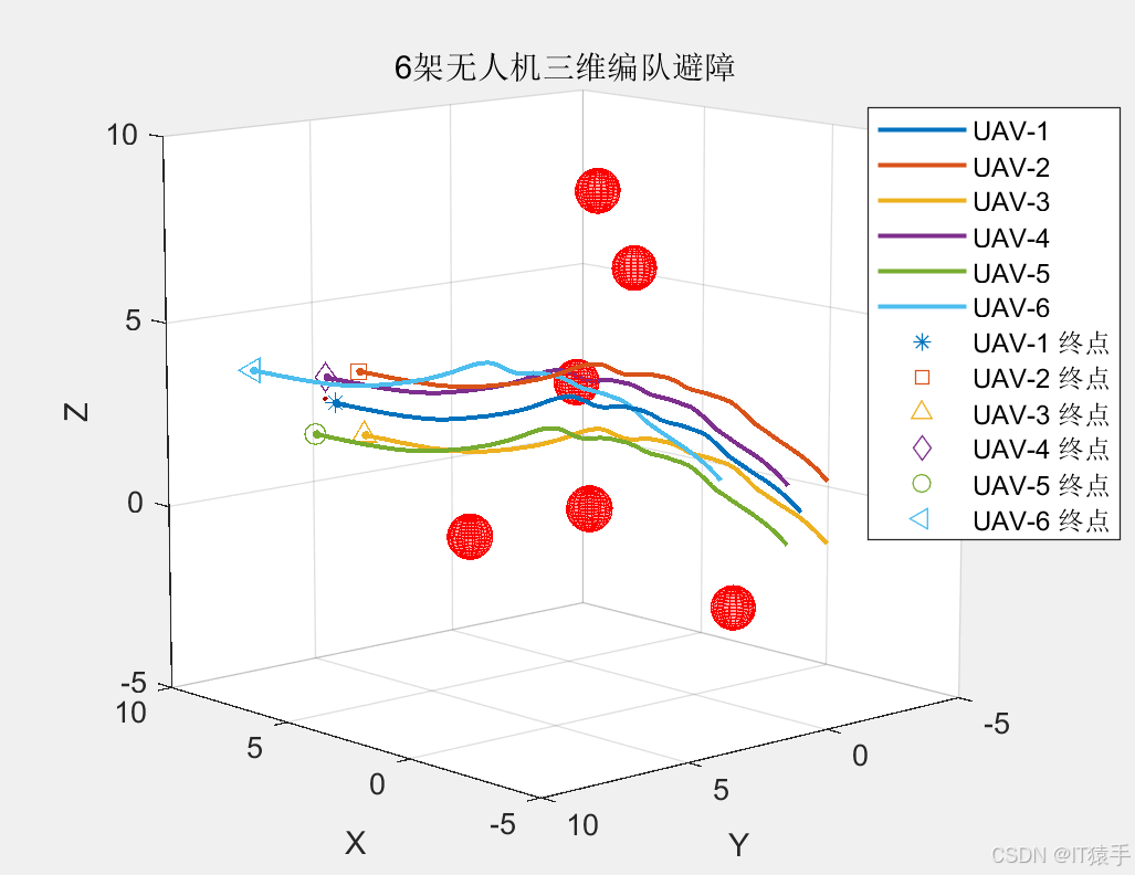 - 3D主场景:绘制三维坐标系、无人机(彩色球体)、动态障碍物(红色半透明球体)、目标点、三维飞行轨迹;