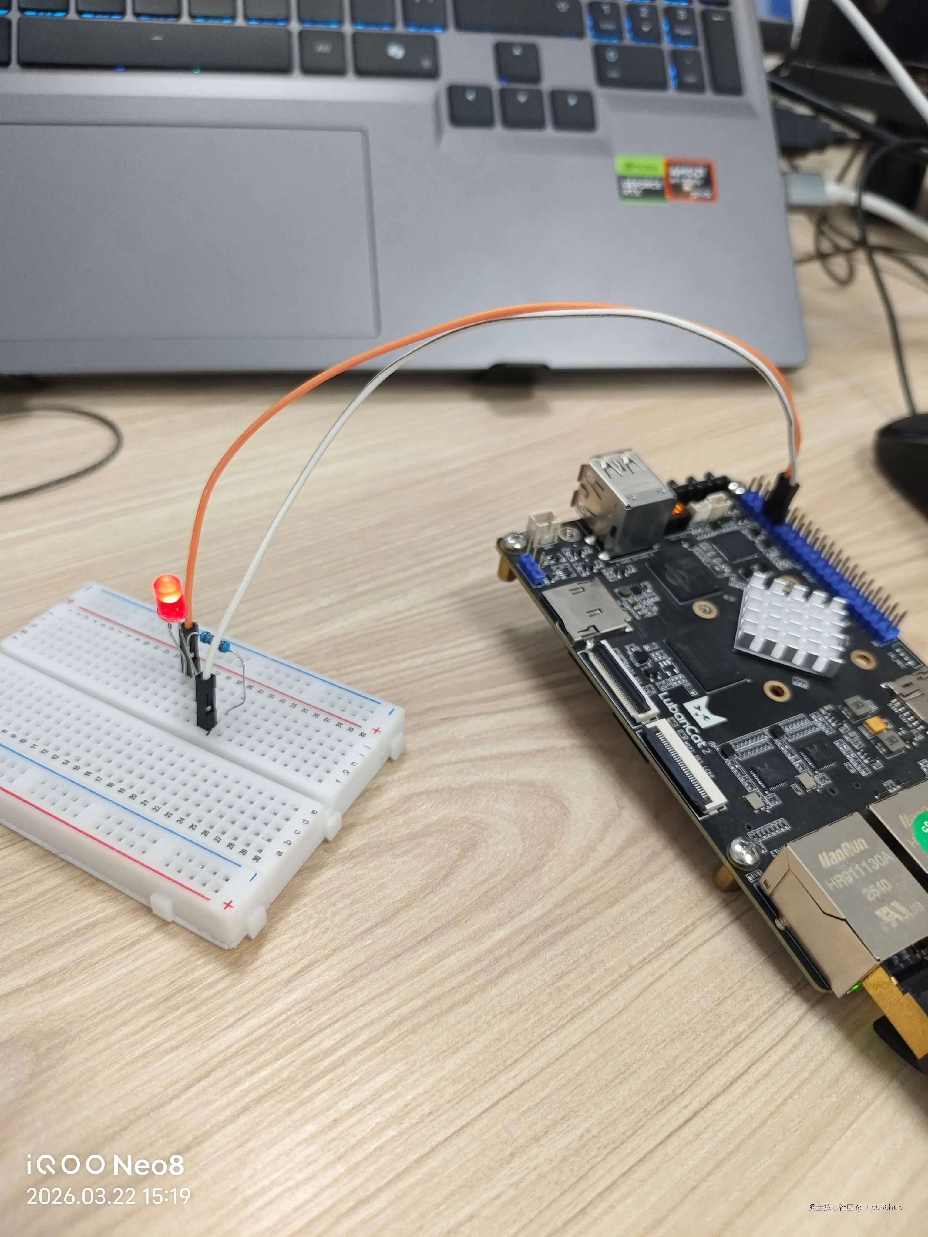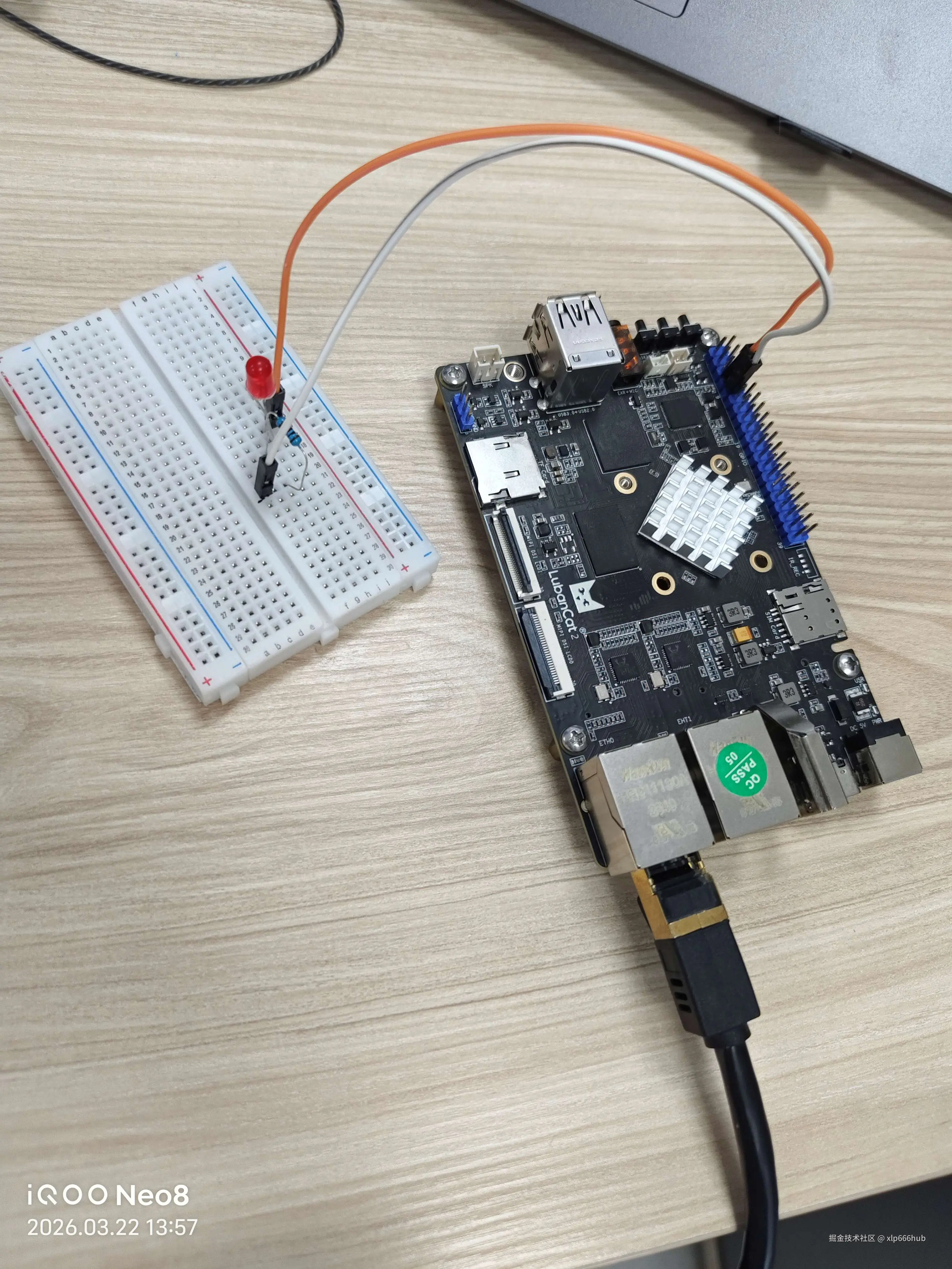 图中我用蓝色的笔圈出来两个引脚,我把 LED 正极接到 GPIO0_B0 上,把负极接到 GND 上。