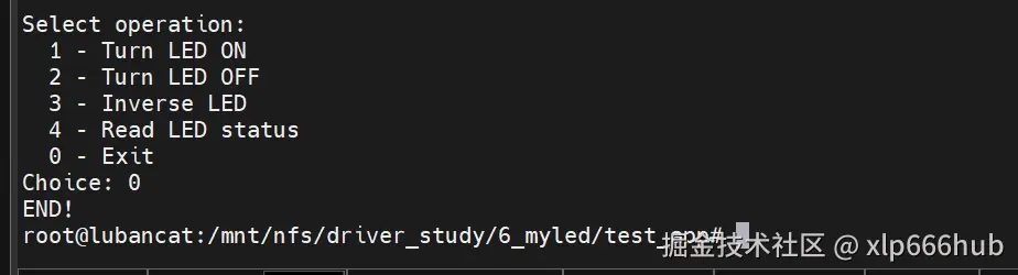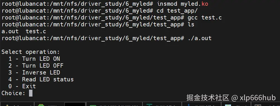- 在用户层编写测试程序,通过系统调用打开并操作字符设备节点文件,从而控制 LED 的状态。