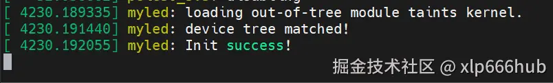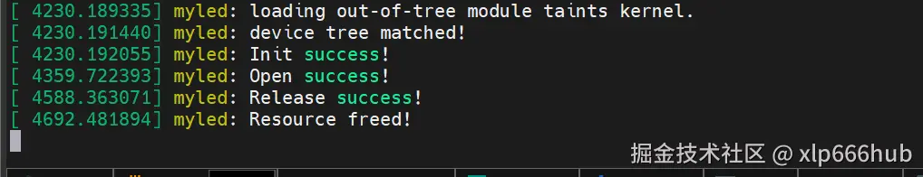 加载模块之后,内核日志如下,表面已经完成了字符设备注册,获取 gpio 等操作: