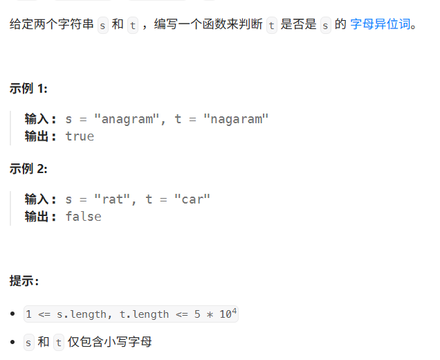 s = "anagram"和t = "nagaram":都是 7 个字母,a 出现 3 次、n 出现 1 次、g 出现 1 次、r 出现 1 次、m 出现 1 次,只是顺序打乱了 → 是异位词 ✅s = "rat"和t = "car":长度一样,但 r vs c → 不是异位词 ❌