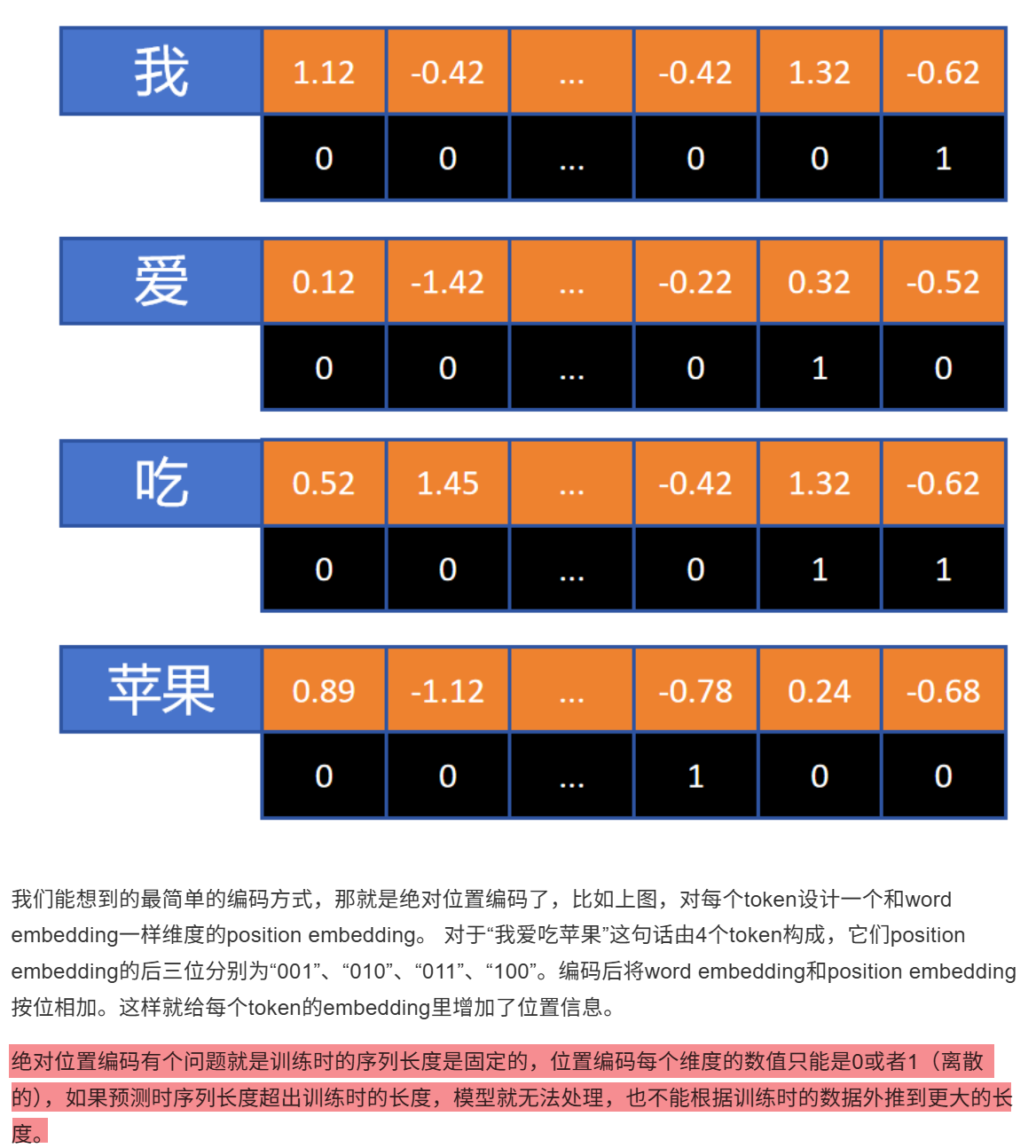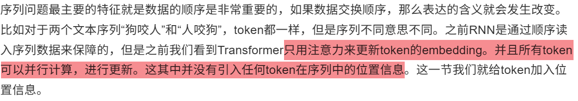"我爱你"、"你爱我"自注意力矩阵权重相同,但表达的意思完全不同,所以需要为token添加位置编码