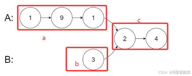 设共同的长度为c,链表A多出来的长度为a,链表B多出来的长度是b