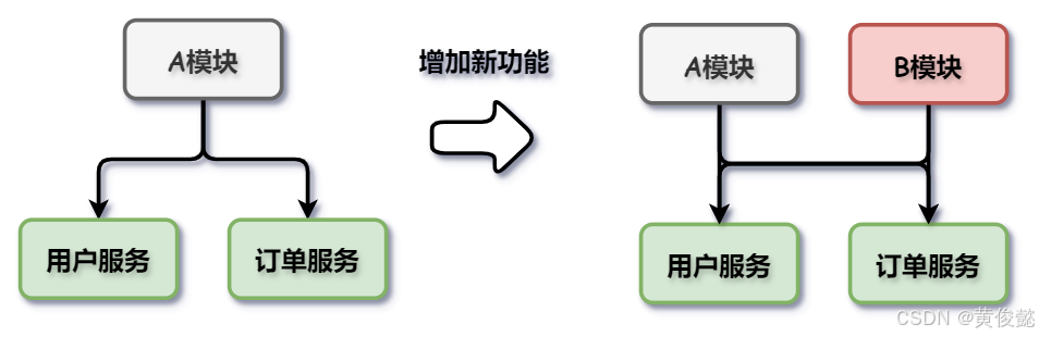 分布式架构是将业务和可复用的服务分离开来。就是说我们的系统经过长时间的发展,有些业务已经渐渐独立了。比如说订单、用户,这些很成熟的业务独立开发测试部署。比如说最开始是一个特别大的系统,里面包括了用户、订单、积分等等,后来我们想扩展一些功能,这些功能也会用到订单服务,这个时候我们可以将原来的系统进行拆分。系统发展到某一个阶段的时候,我们可以将这个用户拿出来成做成一个用户系统,然后将订单拿出来做成一个订单系统,当我们在扩展新功能的时候它直接调用订单系统就可以,并且这两个系统不需要进行更改,它们之间完全通过api接口进行通信。