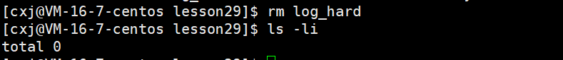 通过上面的演示我们可以看出原文件log.txt中的硬链接数是1,当我们使用log_hard硬链接源文件log.txt之后,源文件log.txt的硬链接数变为2,同时硬链接文件log_hard的硬链接数也为2,此时我们将原文件log.txt删除一下,看看会发生什么