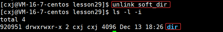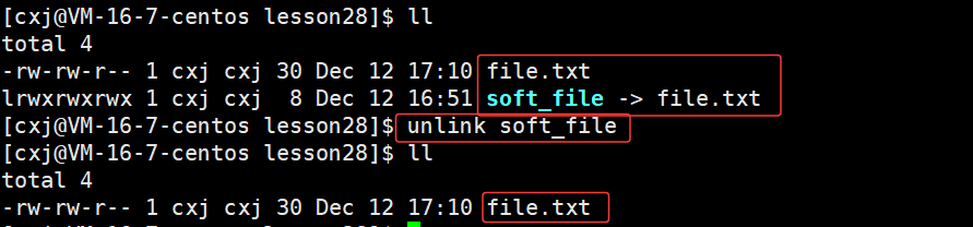 如果要删除软链接文件,那么使用 unlink 软链接文件,即可进行删除