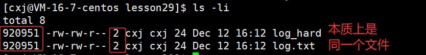 这时我们使用 ls -l -i 指令去查看文件的inode编号,发现硬链接文件log_hard与被链接文件log.txt共享同一个inode编号920951。这表明log_hard文件没有独立的inode编号,也就意味着它不具备独立的文件属性。因此,硬链接文件并非独立文件,因为它缺少专属的inode。