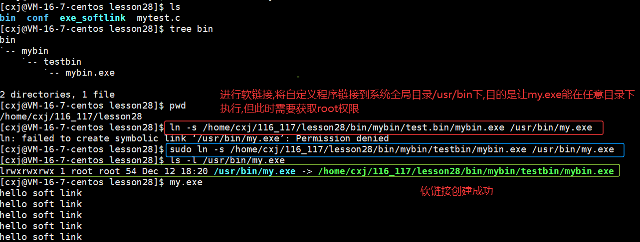 首先使用pwd命令查看当前路径的绝对路径,再用tree命令查看bin目录结构。这样就可以确定可执行程序mybin.exe相对于当前目录的相对路径。将当前绝对路径与mybin.exe的相对路径拼接,即可得到完整的绝对路径。接着使用ln -s命令创建软链接,语法为: ln -s 源文件 目标文件。要在系统指令目录/usr/bin下创建名为my.exe的软链接文件。由于普通用户没有权限修改系统目录,需要使用sudo提权。这样设置后,就可以在命令行中直接通过my.exe来执行mybin.exe程序,无需指定完整路径。