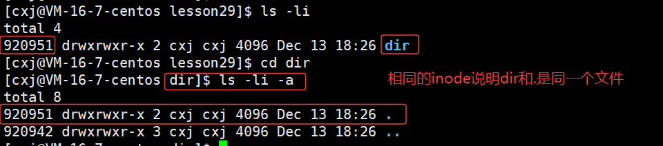 这是因为在dir目录中存在一个隐藏的当前路径符号".",它与dir目录共享相同的inode编号,这说明"."实际上就是dir目录的一个硬链接。