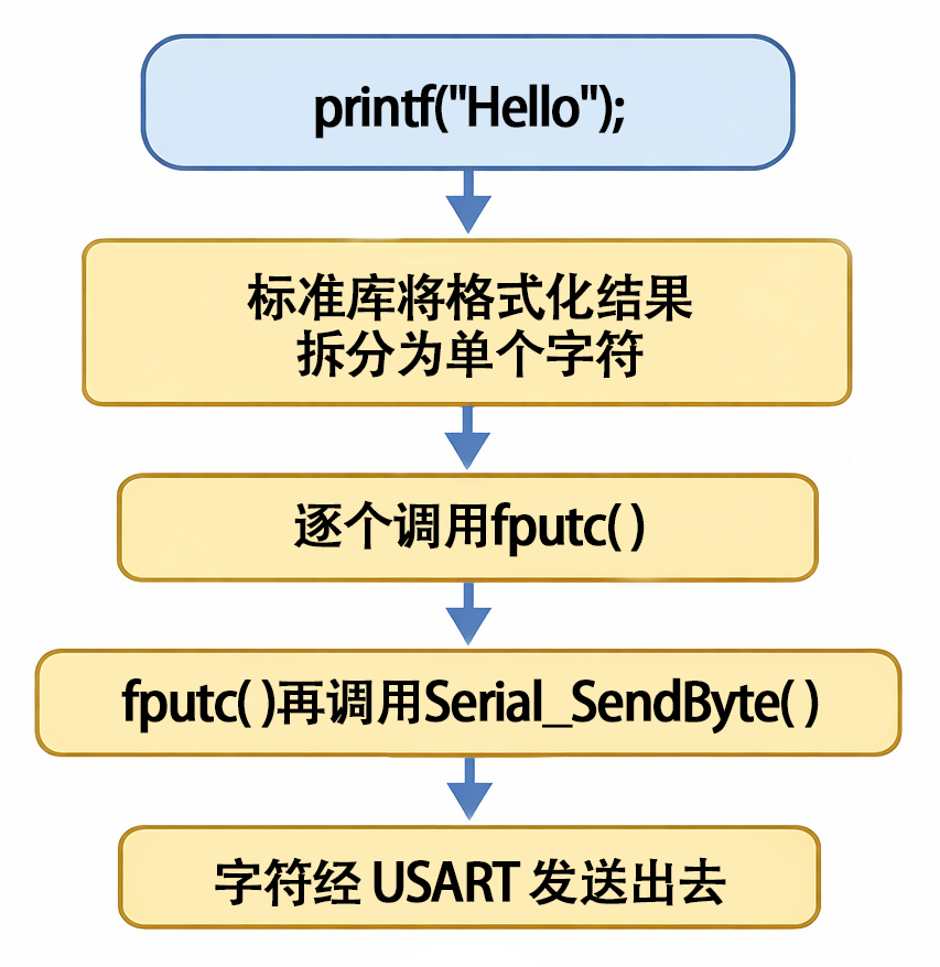 Serial_SendByte(ch); //将printf的底层重定向到自己的发送字节函数