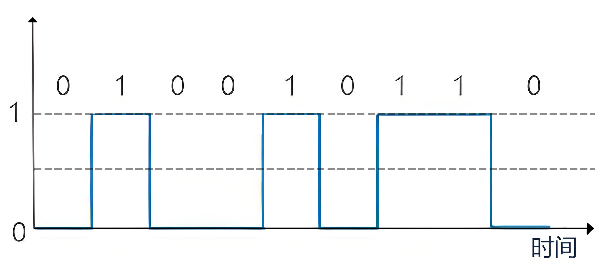 在微控制器(如 STM32)的 基带串行通信(即直接利用高低电平跳变来代表 0 和 1,而不经过高频载波调制,如 TTL 电平标准的 UART)中,物理链路普遍采用基础的二进制调制。线路仅依靠高、低两种电平来表征逻辑状态(例如使用 0V 表示逻辑 0,3.3V 表示逻辑 1)。