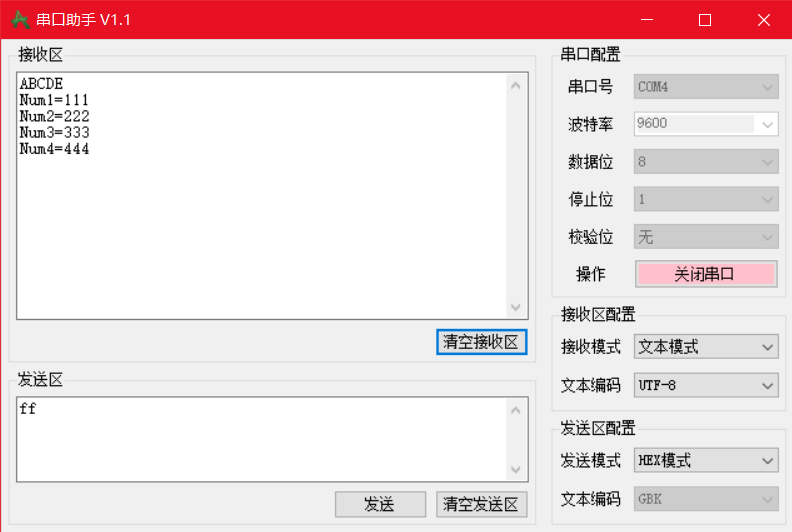 - 与此同时,PC 端串口助手的接收区同步捕获到单片机回传的同一数值(ff),验证了全双工物理链路的完整性与中断收发逻辑的正确性。