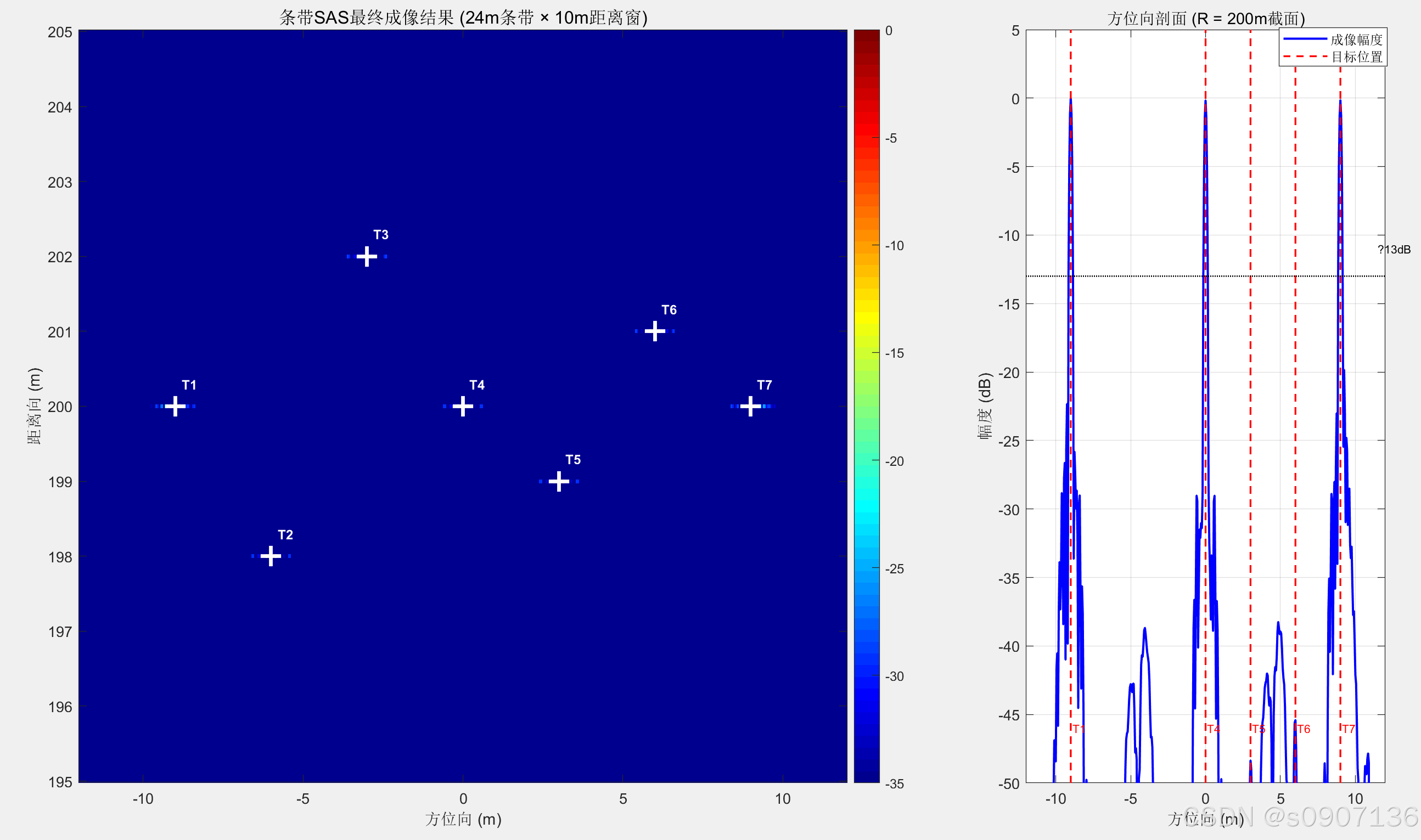 系统模拟了7个点目标散布在方位向 [-12m, +12m],总长达 24 米的条带区域内。