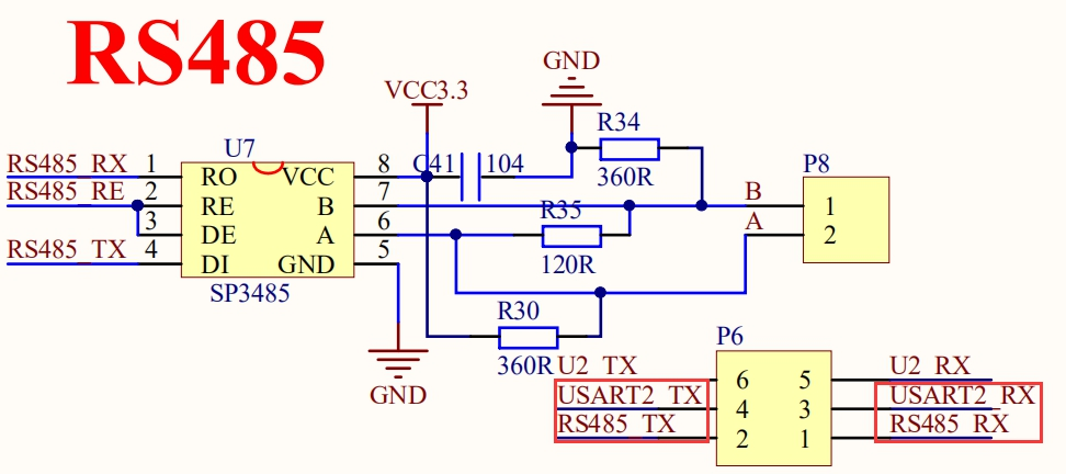 从电路图中可以看到, SP3485(MAX3485) 芯片的 RO 和 DI 管脚连接 P8 端子的 1、 2 脚, 该端子的作用在串口通信章节硬件设计中介绍过, 用来切换 RS232和 RS485 通信的, 如果要做 RS485 实验, 即使用短接片把 P6 端子的 1、 3 管脚短接, 2、 4 管脚短接。 在 STM32F1 芯片的串口 2 管脚 PA3 和 PA2 上, SP3485 芯片的 DE 与 RE 短接在一起连接在 STM32F1 芯片的 PD7 上, 通过 PD7 管脚就可以控制SP3485 的收发, 当 PD7=0 时, 为接收模式, 当 PD7=1 时, 为发送模式。 要注意以太网模块的 DM9000_RST 也使用了 PD7 管脚, 所以它们不能同时使用, 只能分时复用。 图中的 R35 电阻为匹配电阻, 大小为 120 欧。 图中另外 2 个电阻 R34和 R30 为偏置电阻, 用来保证总线空闲时, A、 B 之间的电压差都会大于 2V(逻辑 1) , 从而避免因总线空闲时, A、 B 压差不定, 引起逻辑错乱导致出现乱码。