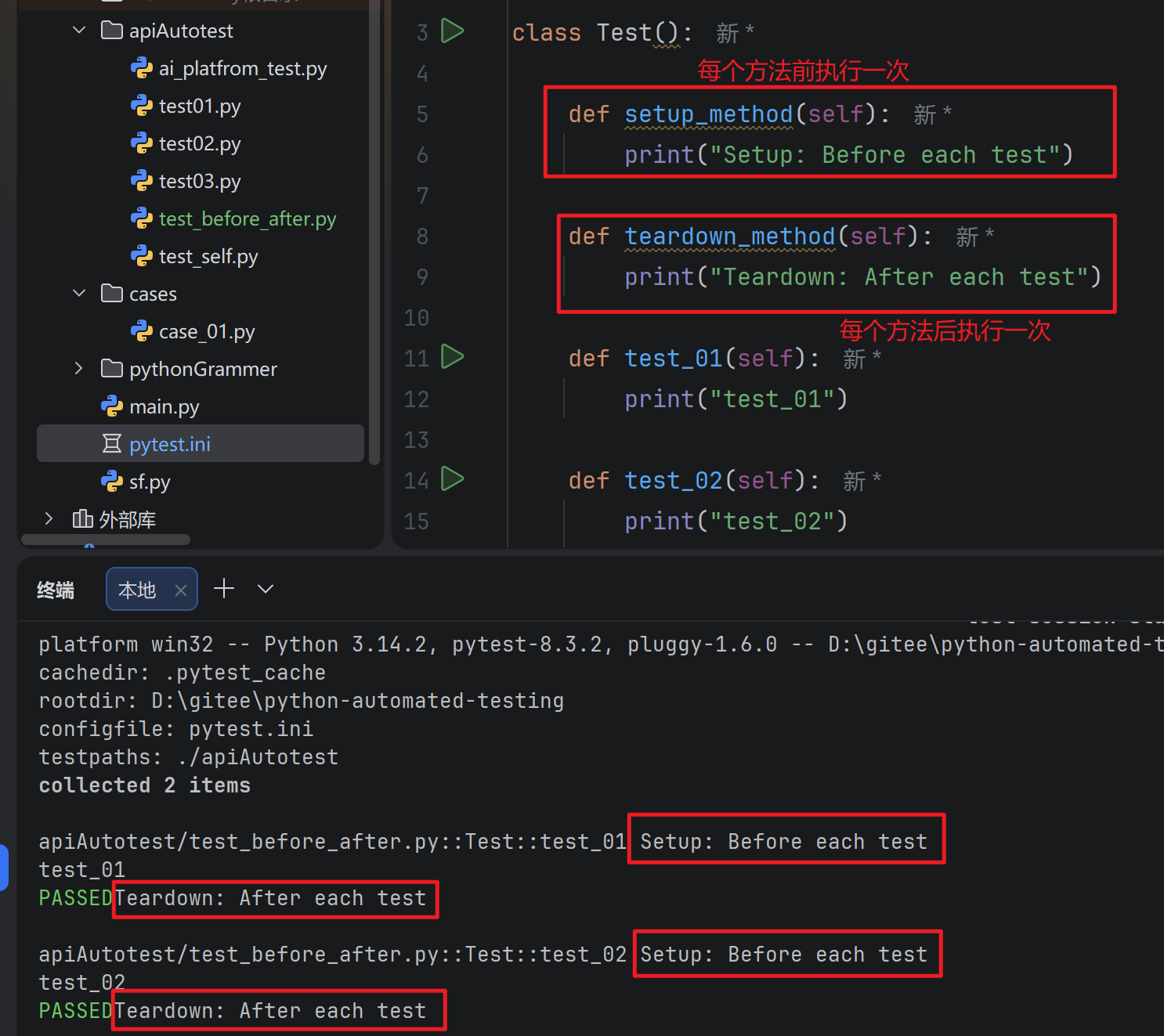 - setup_method 和 teardown_method:这两个方法用于类中的每个测试方法的前置和后置操作