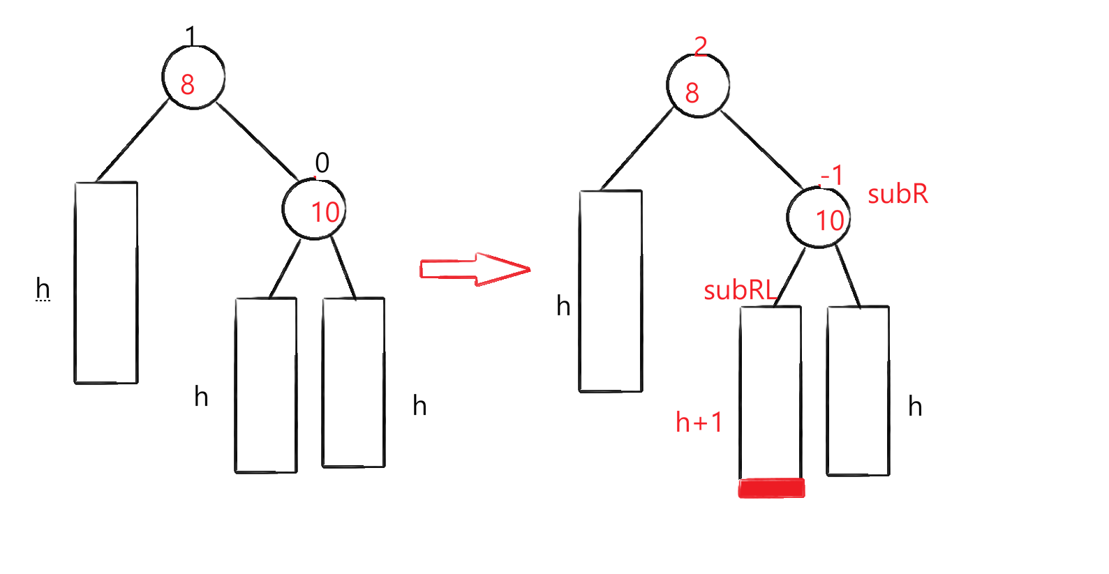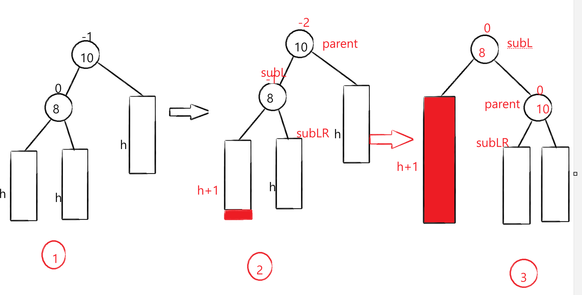 需要右旋转的情况都可以抽象成图中的第一阶段,没有例外,所以我们仅通过左子树头节点的-1就可以判断需要右旋转(-2并不能判断是不是需要右旋转)