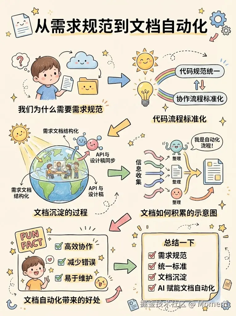 需求规范阶段是整条链路的起点。先把这一步打牢,后面的开发联调、测试优化才不会一路踩坑。这里要做的事,本质上是把团队里各自为战的习惯和经验,沉淀成一套大家都认可的统一标准,既预防潜在风险,又减少日常协作里的摩擦。为了方便梳理,可以把这一阶段拆成三块,对应代码与接口、文档与知识库,以及用 AI 做文档自动化。