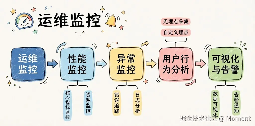 运维与监控是前端工程化的最后一道防线,目标是实时感知风险、快速定位原因、持续优化体验,让线上系统稳定、用户行为可观测。下面按性能监控、异常监控、用户行为分析、可视化与告警四块说,最后补一版低成本与大型企业的工具链参考,以及几条容易踩的坑。