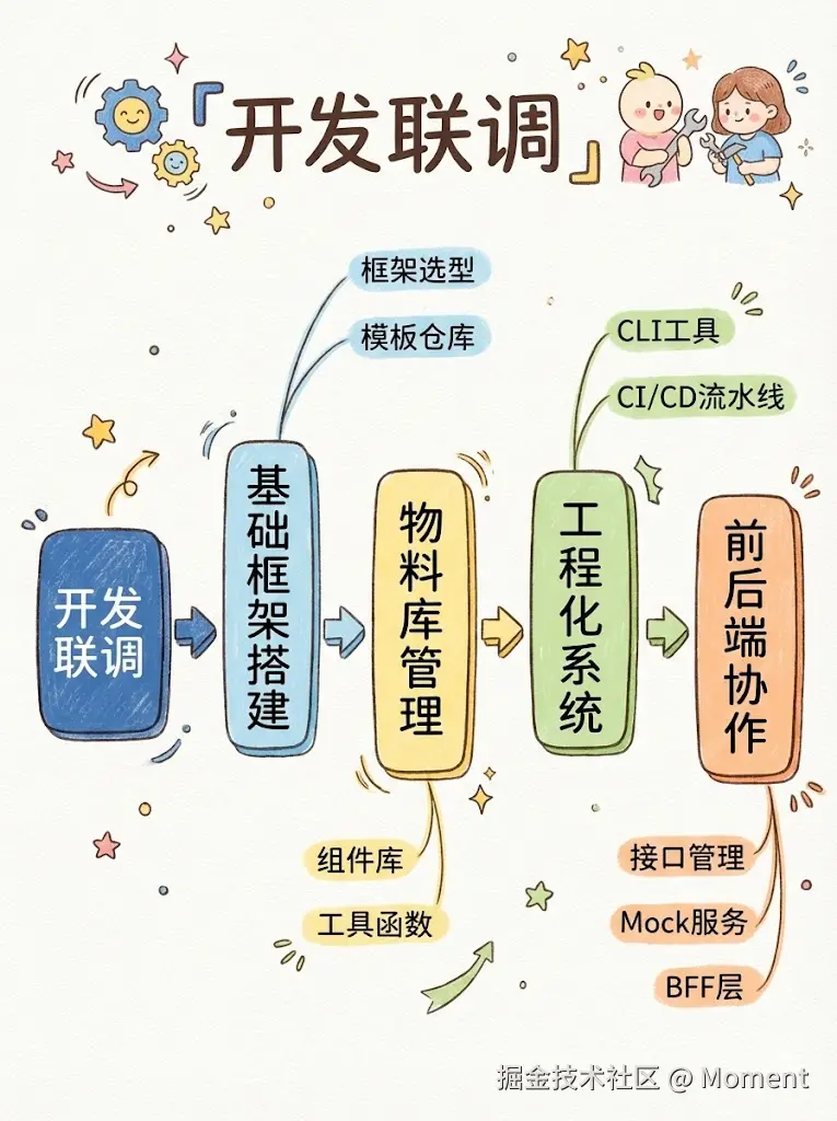 开发联调阶段是前端工程化真正动手写代码、跑起来的那一段,目标很清晰,就是高效协作、减少阻塞、保障代码质量,让前后端和设计之间尽量无缝衔接。下面按基础框架、物料复用、工程化流水线、前后端协作四块来说,最后补几条联调时容易踩的坑。