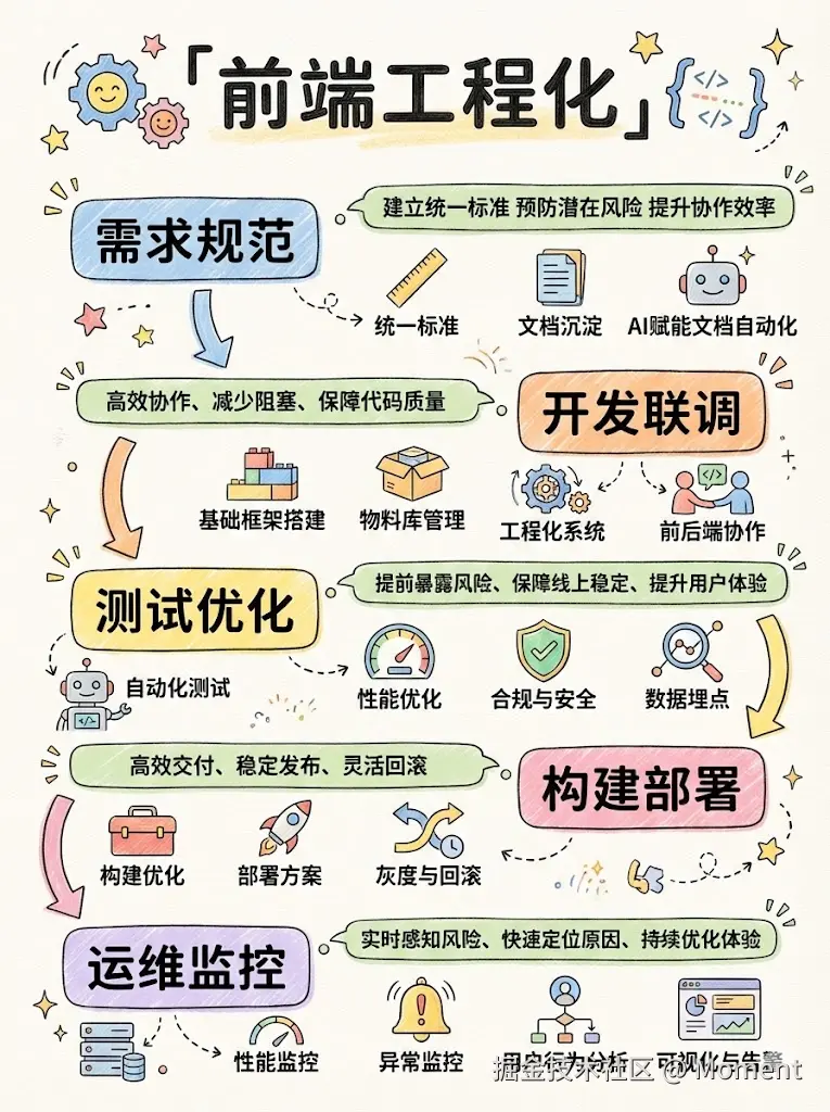 接下来我们按常见阶段展开,依次是需求与规范、开发与联调、测试与优化、构建与部署、运维与监控。每个阶段会写目标、推荐流程、常用工具、典型场景,以及适合用 AI 或自动化做得更好的地方。