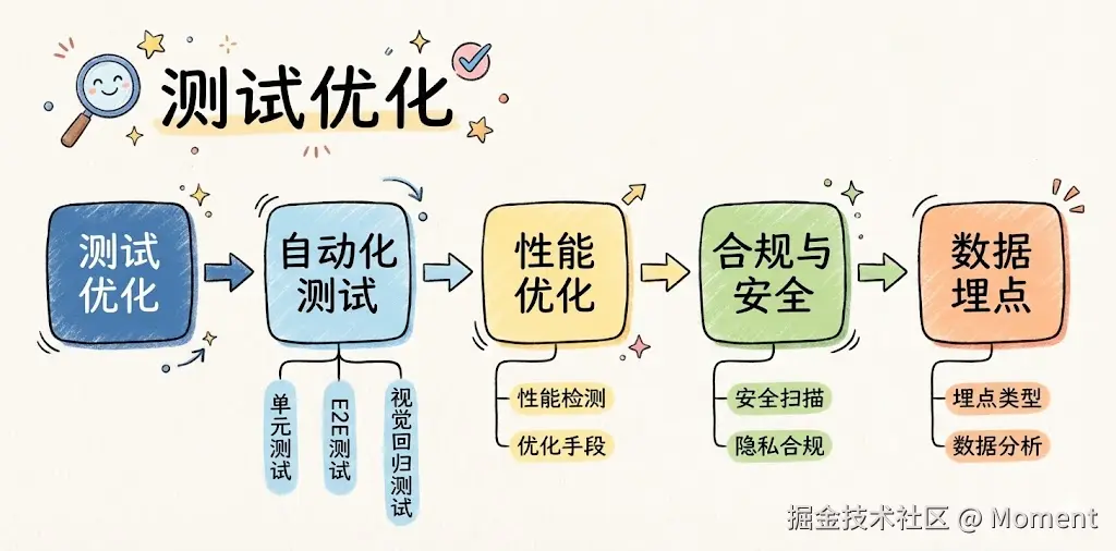 测试与优化阶段还有几点容易踩坑。一是别盲目追求 100% 测试覆盖率,优先把核心链路(登录、支付等)兜住,再按需补边缘场景。二是性能优化别撒胡椒面,内部管理后台等低频页面不必死磕,把资源留给用户高频访问的页面。三是埋点必须拿到用户授权,禁止收集设备 ID、IMEI 等敏感信息,否则会踩数据隐私的雷。