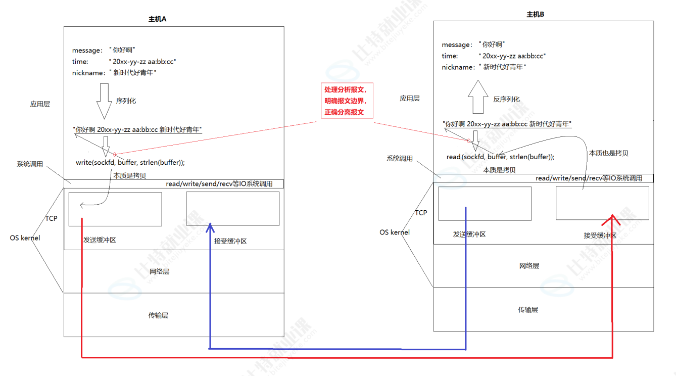 这里有一点需要注意的是,因为TCP是面向字节流的,所以当读取方在读取的时候,可能读到一个完整的json请求,也可能会读到半个、一个半等等,也就意味着read本身并不保证读取到的报文的完整性!它只保证有数据的话就读上来,那这时就需要应用层程序员自己保证!