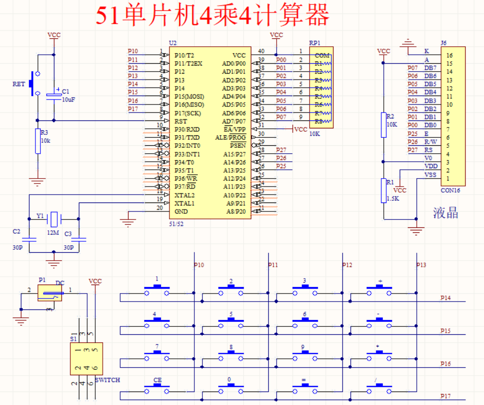 由51单片机+4*4矩阵按键+LCD1602液晶显示屏+电源等构成