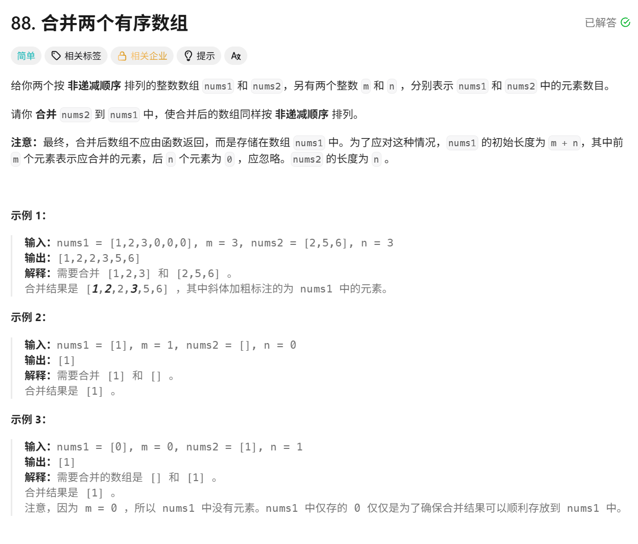 2.首先我们看到题目告诉我们nums1和nums2是升序的,nums2需要合并到nums1中,而不是重新生成一个数组,最终的nums1结合了nums2的元素后也要是有序的。