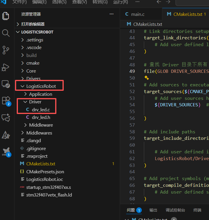 DRIVER_SOURCES变量 ,导致只保留最后一行file(GLOB DRIVER_SOURCES "LogisticsRobot/Middleware/*.c"),前两行的Driver和Application目录的源文件会丢掉。