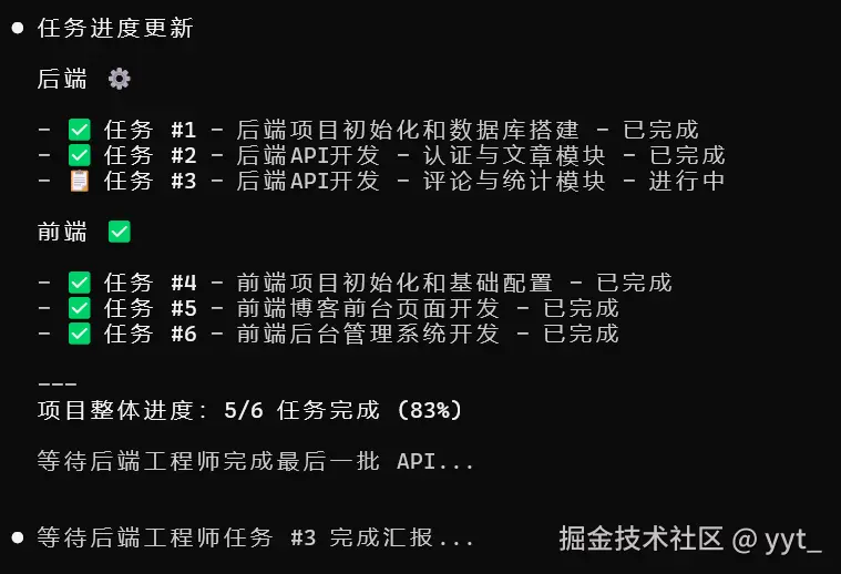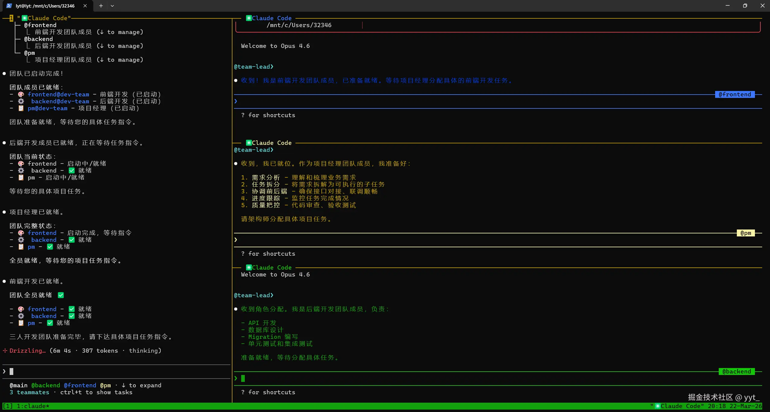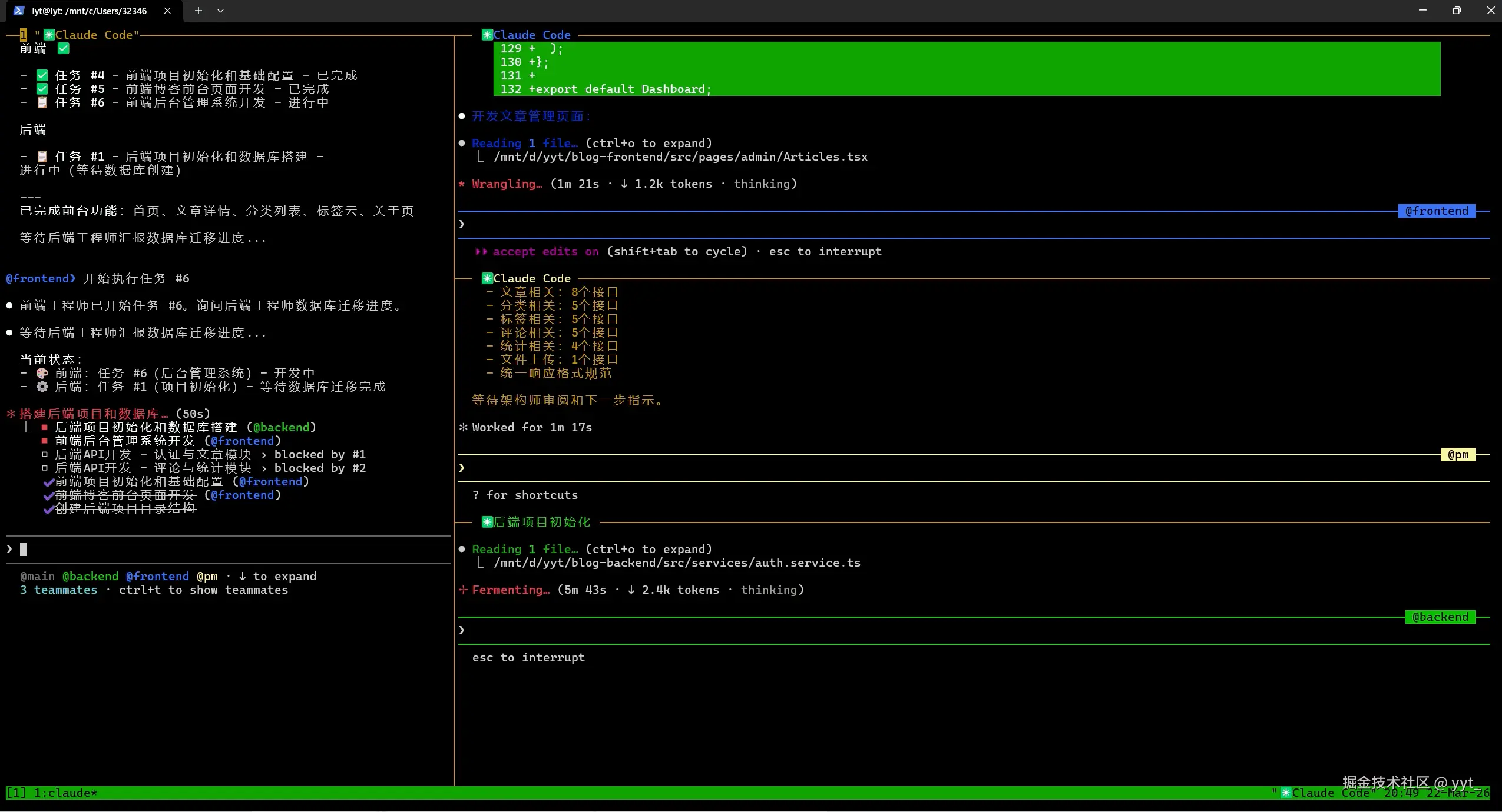 最近玩了一下 Claude 的多 Agent 协作功能 ------ 通过接入 Tmux 分屏同时拉起项目经理、前端、后端三个角色,让它们组成一个团队帮我做一个完整的博客系统。使用过程中踩了不少坑,记录一下真实感受。