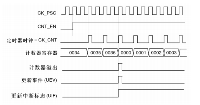 更新中断会先在状态寄存器里面置一个中断标志位,这个标志位会通过中断输出控制,到NVIC申请中断