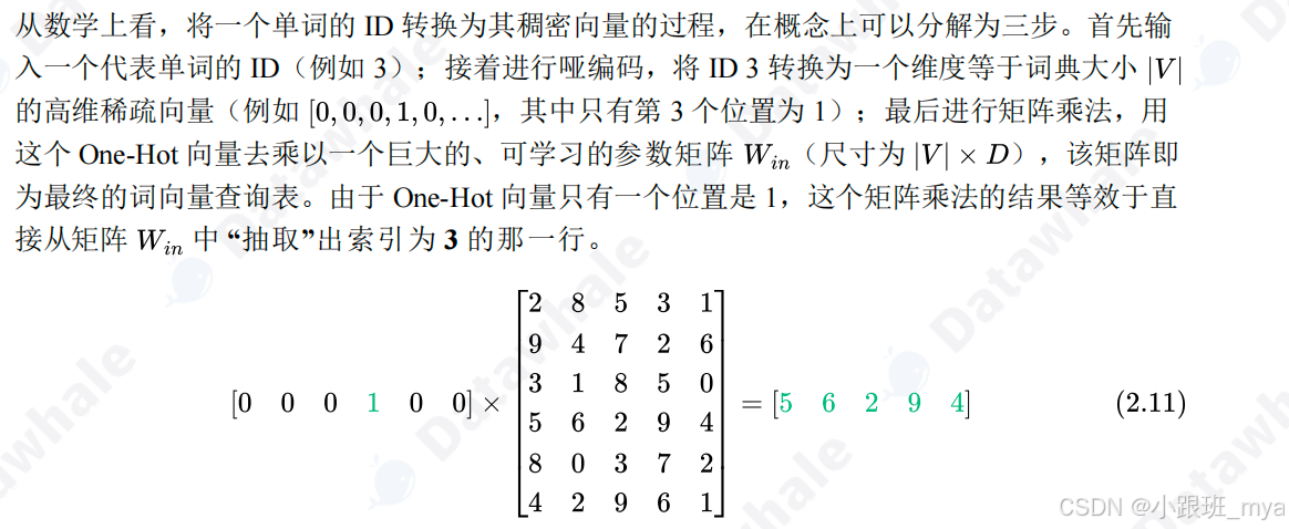 - 语义鸿沟,任意两个不同词的独热向量都是正交的(点积为 0);点积是通过将两个向量的对应元素相乘再求和来计算的;在独热编码中每个向量只有一个位置是 1 ,其余都是 0 ,对于任意两个不同词,值为 1 的位置必然错开。