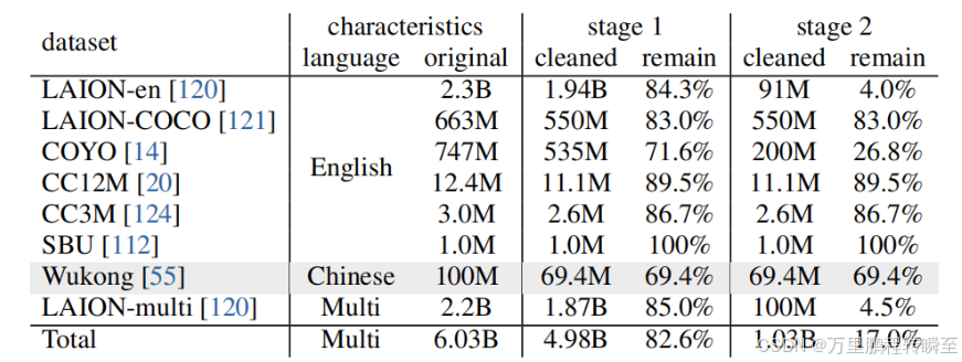 在微调阶段,精心选择数据集,以提高在各种多模态任务中的模型性能。表1b总结了本阶段使用的数据集。在表1中,已经为每个数据集进行了语言注释。对于最初是英文的数据集,作为"zh"的注释表示我们已经使用翻译pipeline将其翻译成中文。例如,COYO [10]和GRIT [90]最初是英语数据集,已经将它们翻译成了中文。