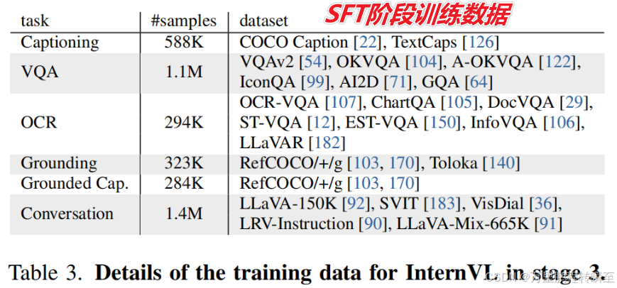 InternVL基于互联网开源数据采集了6B数据,经过滤后一阶段用了5B数据,二阶段用了1B数据。SFT阶段,用了4M数据(二阶段的0.4%)。InternVL1.5与上一版本相比,扩大了训练数据集的纳入范围(尤其是关于ORC任务,进行了细粒度的划分),并且设计了**翻译流程,**补充中文语料训练数据的不足,同时针对测试任务针对性设计了SFT数据。