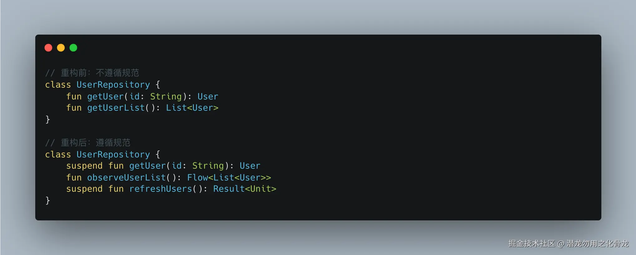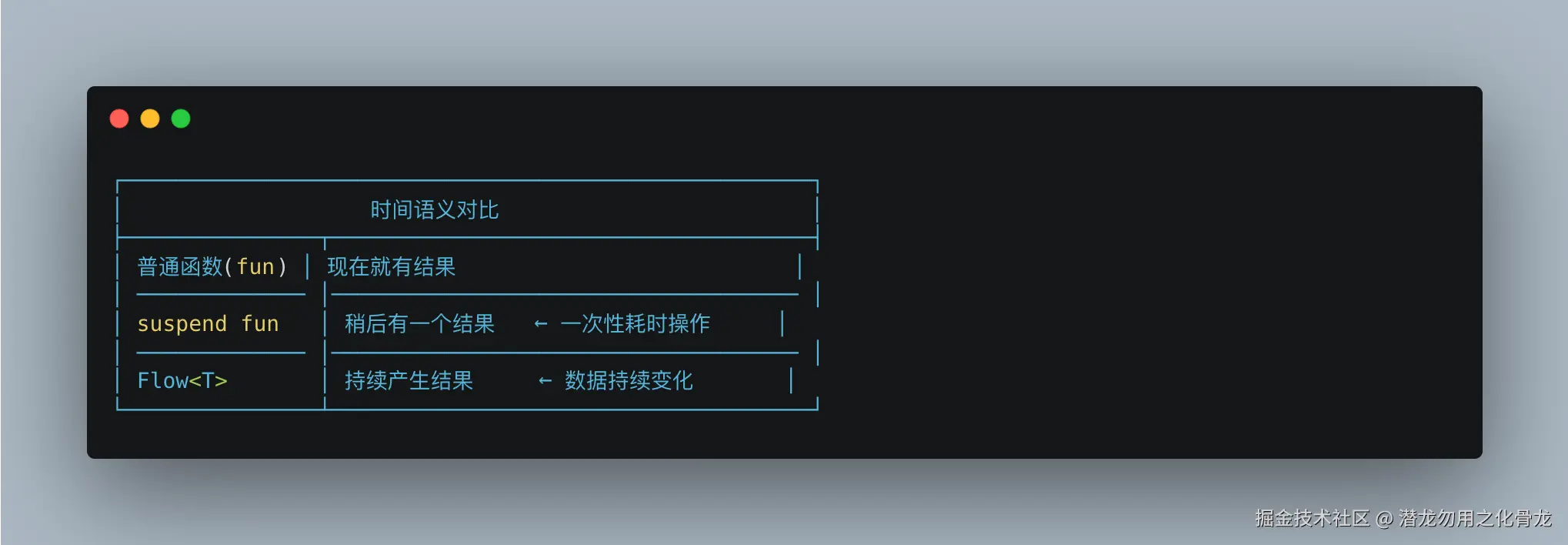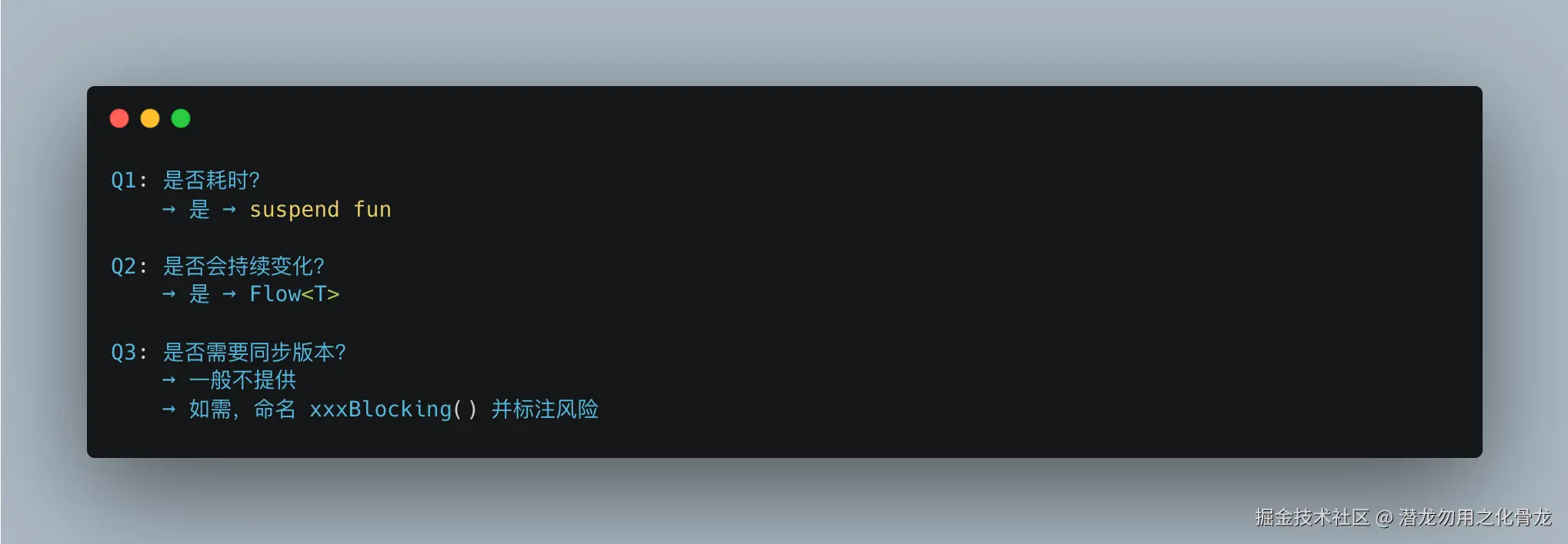 suspend,就知道"这里会挂起";看到Flow,就知道"数据会持续变化"。 接口说真话,架构才能走得稳。