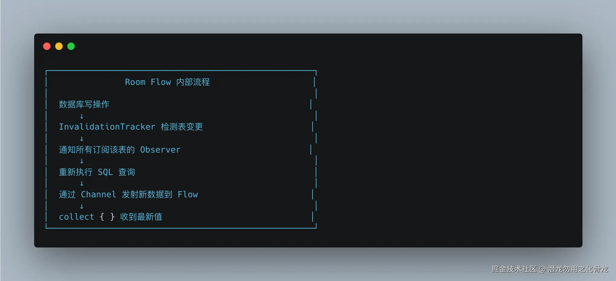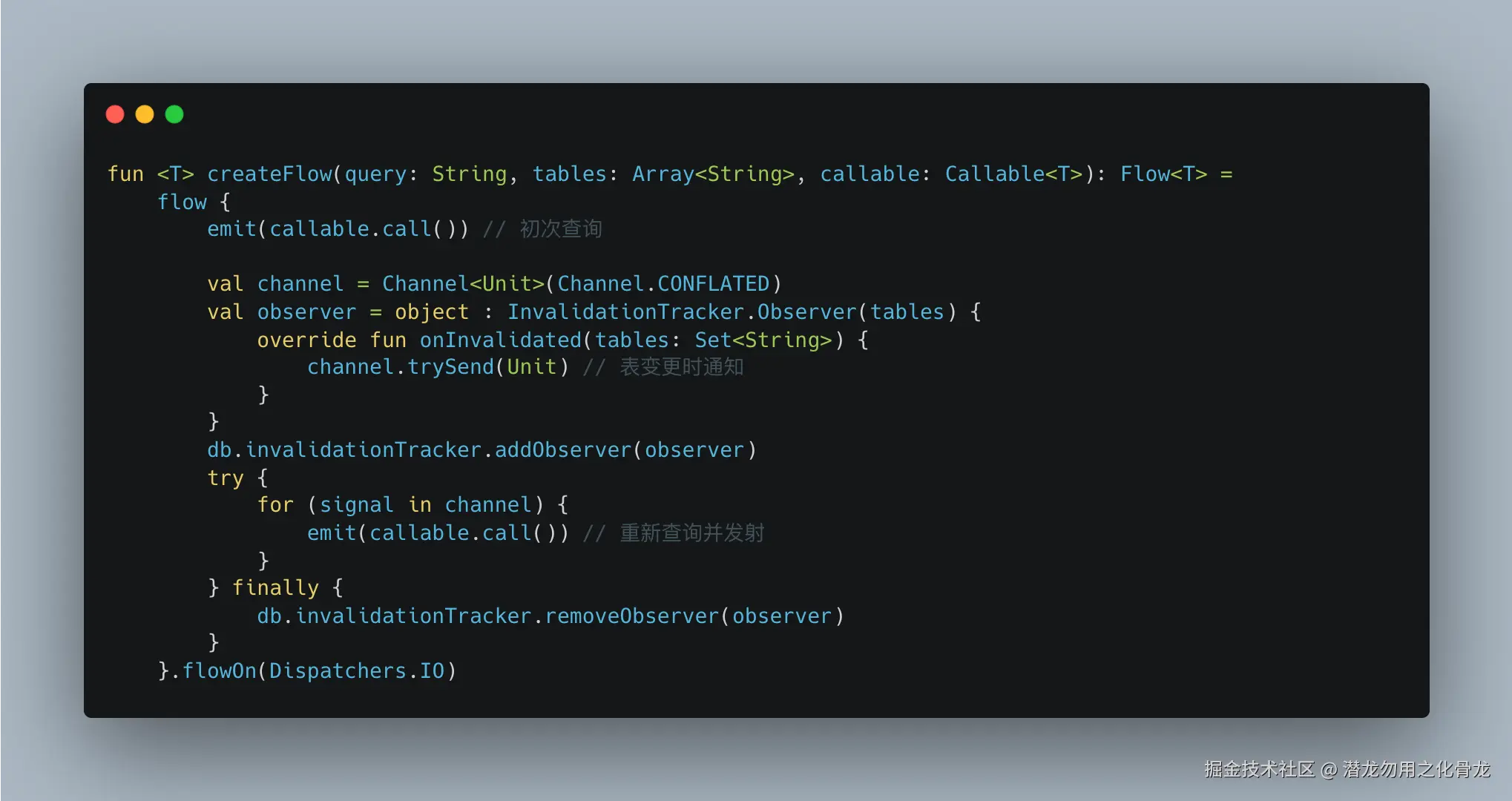 InvalidationTracker监听 SQLite 的表级变更Channel.CONFLATED保证高频写入时不堆积,只取最新信号.flowOn(Dispatchers.IO)保证查询在 IO 线程,collect在调用方线程