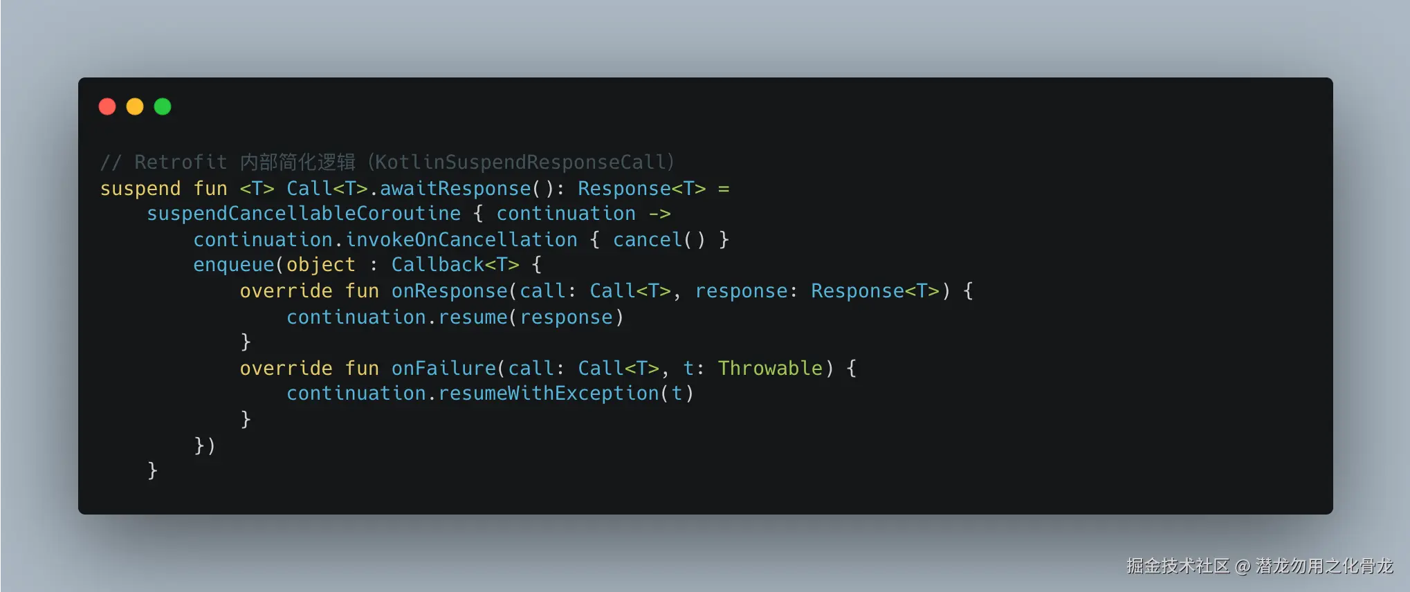 本质:Retrofit 把 OkHttp 的异步回调,封装成了协程的挂起/恢复,对调用方完全透明。