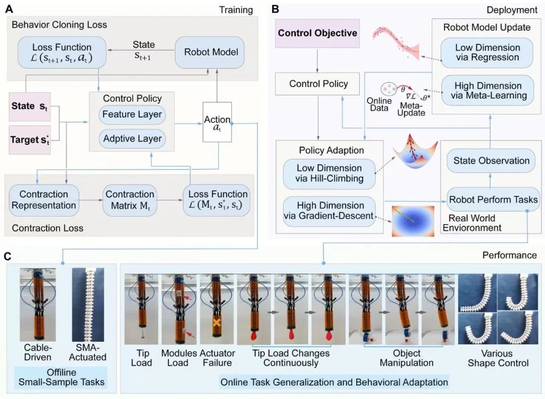 近日,东南大学机械工程学院机器人系唐志强副教授、王乾乾教授联合新加坡国立大学Cecilia Laschi 教授和美国工程院院士、麻省理工学院 Daniela Rus 教授团队在国际顶级综合性学术期刊 Science Advances 发表题为"A general soft robotic controller inspired by neuronal structural and plastic synapses that adapts to diverse arms, tasks, and perturbations"的研究论文,提出了一种面向软体机器人的通用学习与控制框架,在多任务执行、复杂环境适应以及跨平台泛化方面取得重要进展(图1)。