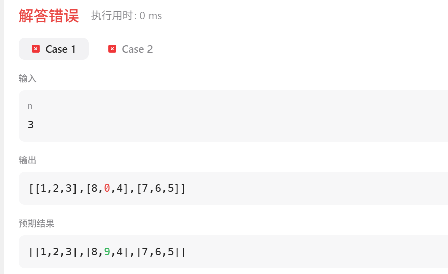 修复后 for _ in range(n//2):n=3 时循环 1 圈,n=4 时循环 2 圈,刚好覆盖所有非中心的位置。