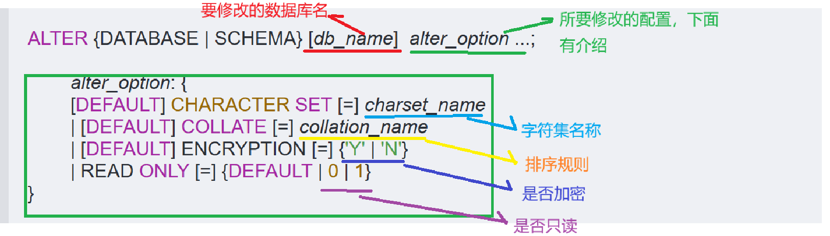 注意:解析图中,数据库名被[]括起来,但不是说,不指定数据库名就可修改数据库配置,而是之前已经用**use database_name;**选定数据库了,在选定数据库的前提下可以省略数据库名,直接修改当前已选定的数据库配置。下面有易理解的修改实战。