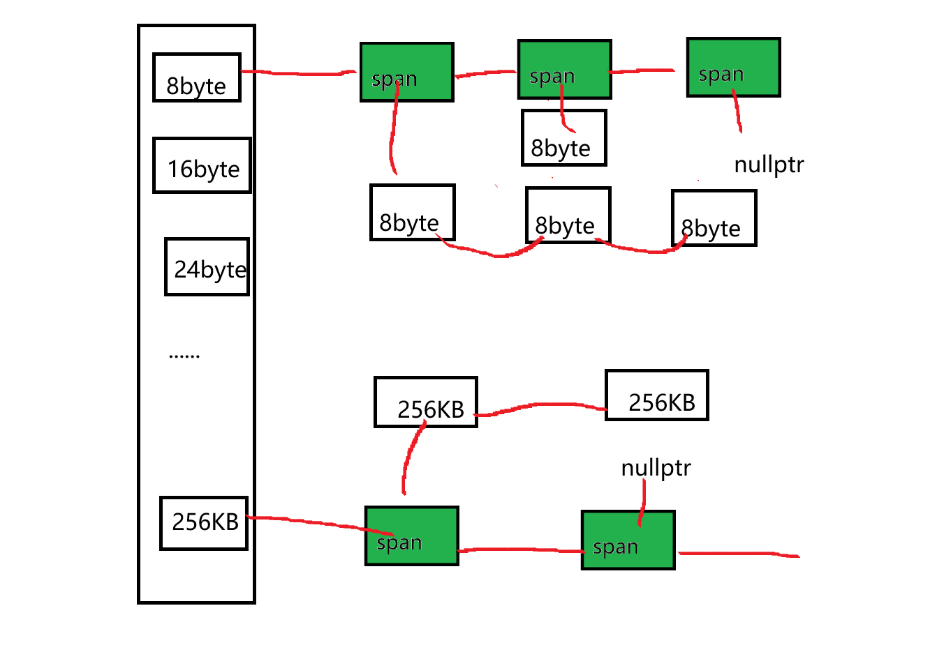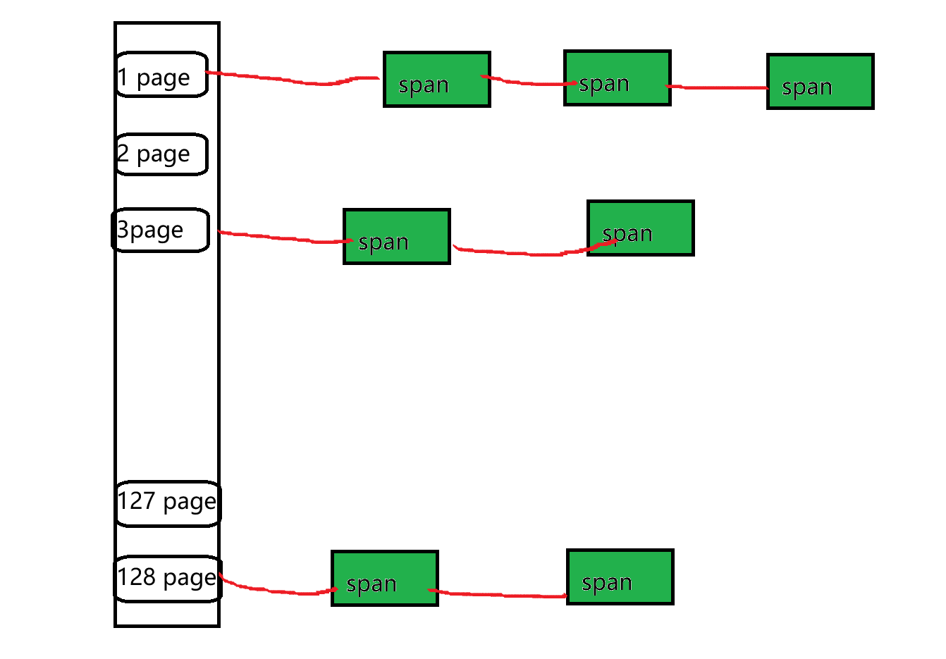 需要注意的是central cache和page cache 的核心结构都是spanlist的哈希桶,但是他们是有本质区别的,central cache中哈希桶,是按跟thread cache一样的大小对齐关系映射的,他的spanlist中挂的span中的内存都被按映射关系切好链接成小块内存的自由链表。而page cache 中的spanlist则是按下标桶号映射的,也就是说第i号桶中挂的span都是i页内存。
