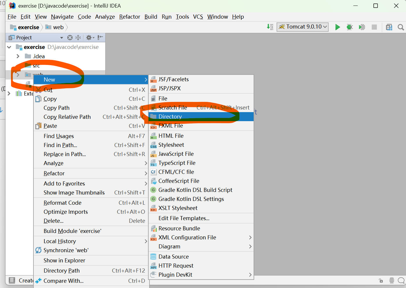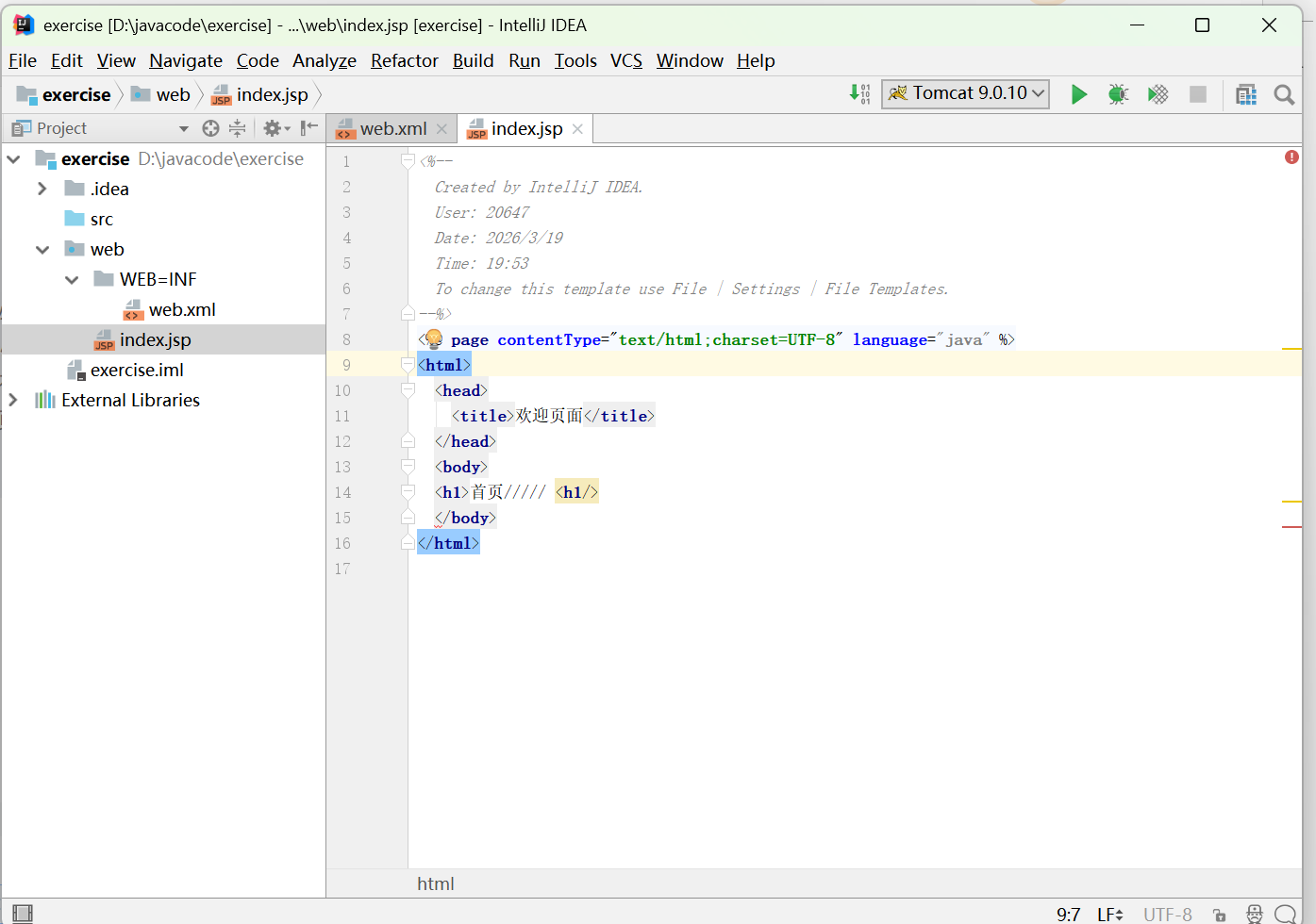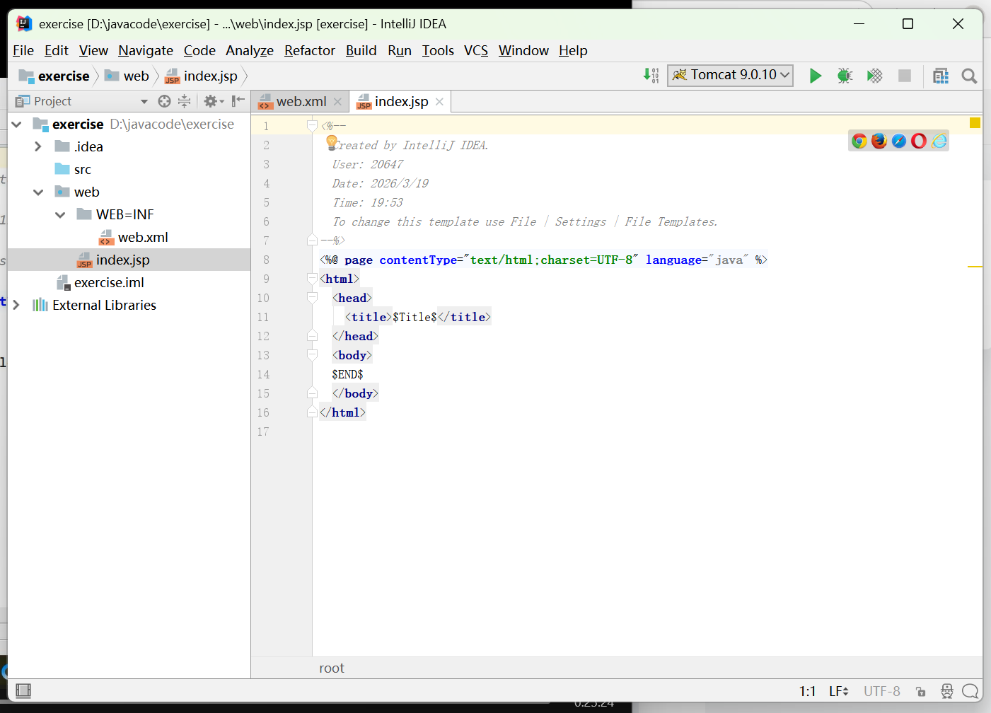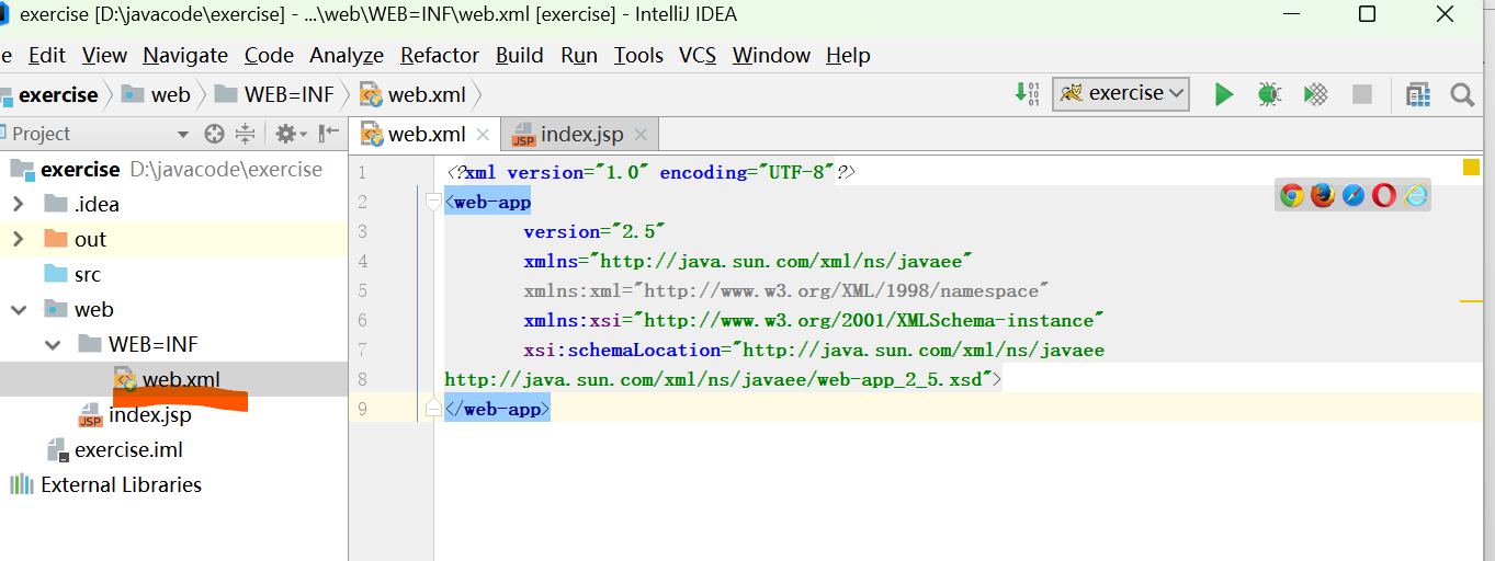 exercise项目按 Web 规范(包含 WEB-INF、web.xml 等)生成一个解压后的目录(而非压缩包);启动 Tomcat 时,IDEA 会自动把这个解压目录部署到 Tomcat 的运行目录中;