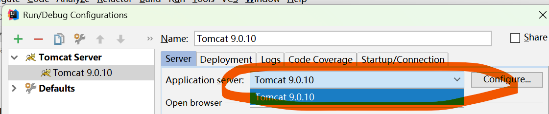 Tomcat 9.0.10,表示 IDEA 会调用你本地安装的这个版本的 Tomcat 来运行项目。- 点击