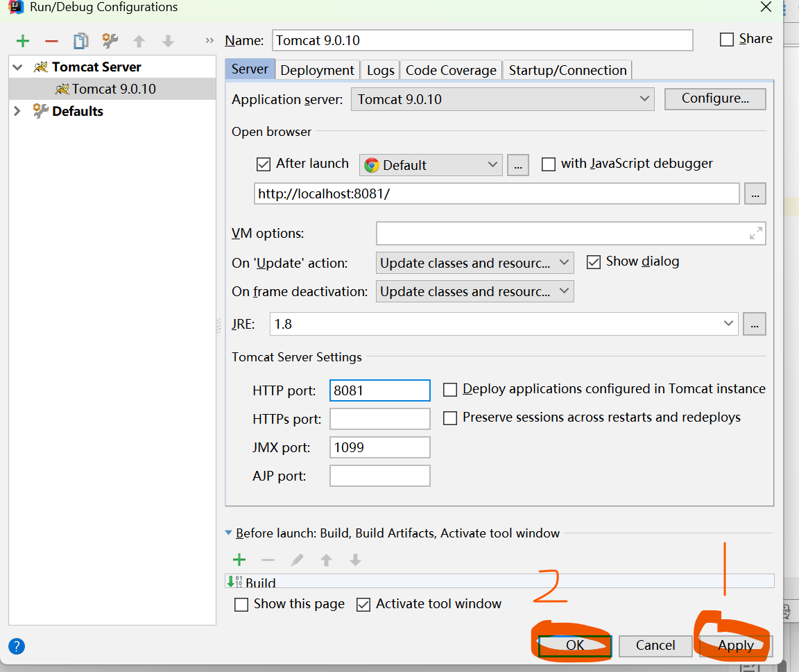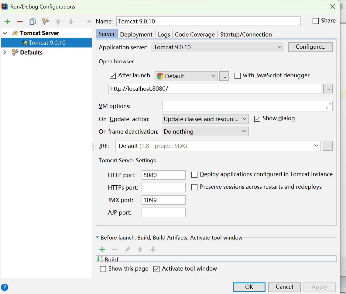 Build, Build Artifacts表示在启动 Tomcat 之前,IDEA 会先自动编译项目(Build),并构建部署用的 Artifact(比如war exploded),确保你运行的是最新的代码。