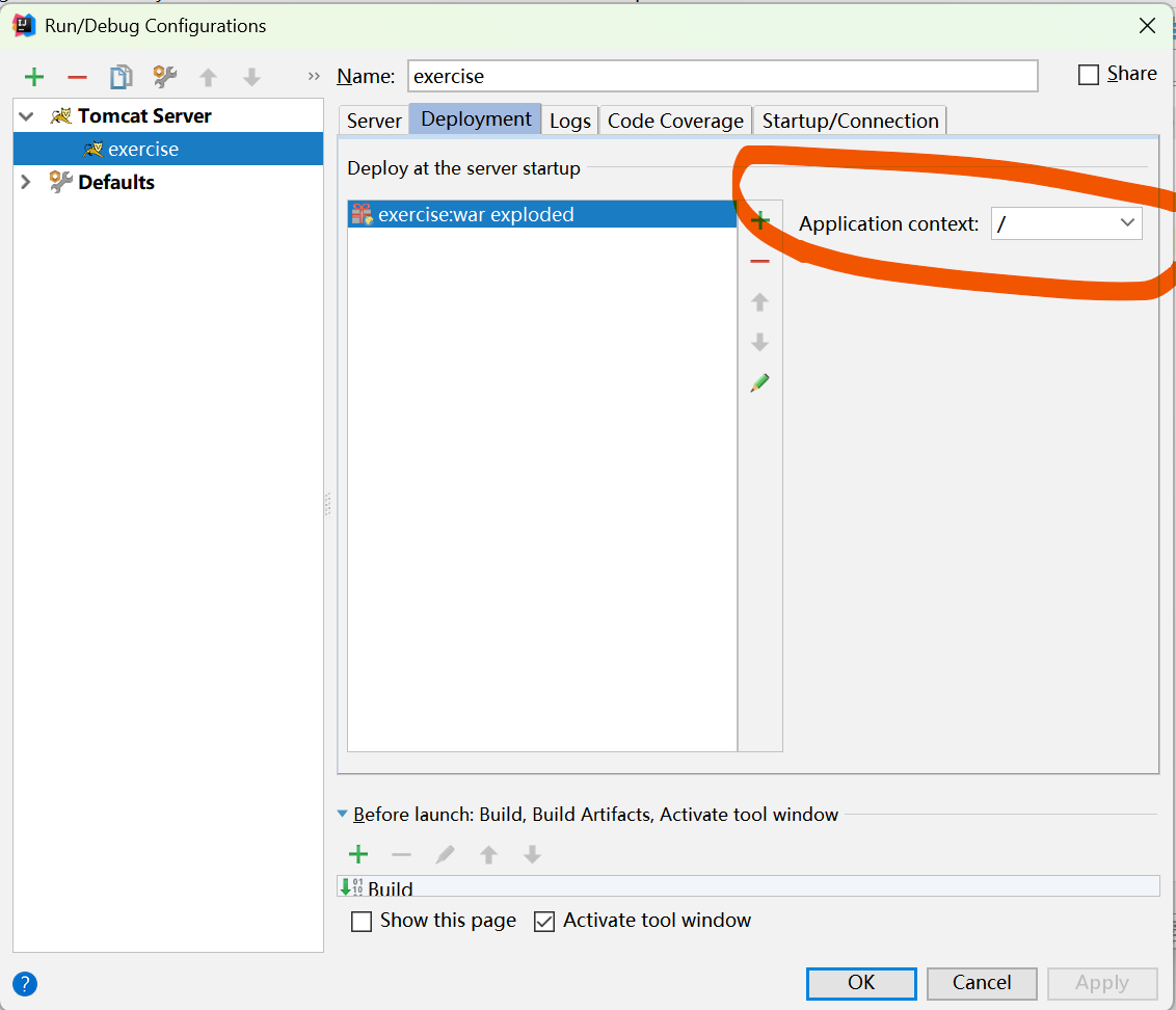 在这里写/,就是表示吧这个项目访问路径映射为/,tomcat访问的时候默认优先访问/的项目,不用写具体的项目名字就可以找到,也可以给这个起名字,比如写/exercise,就是这个项目的访问路径变成了