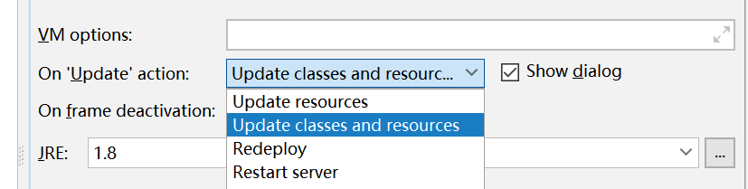 Update classes and resources的效果 :你改完代码后,只要点击浏览器(IDEA 失去焦点),IDEA 会自动触发更新,把新代码 / 资源同步到 Tomcat------ 连手动点 "Update" 都省了,更方便。