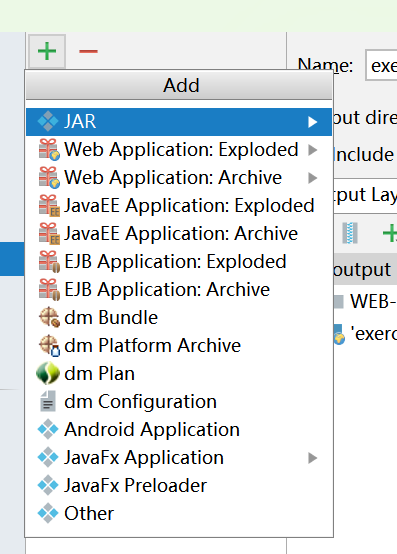 这个idea创建webapplication的时候就自动会选择war exploded这个方式,如果想要选择其他方式,在这个位置选择项目配置然后点击左侧的项目部署产物,可以看到是默认的这个,然后点击上方的加号