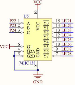 口的驱动电流简单许多。另一方面,这样也能减轻主芯片的负担。- 若多个数码管,可以使用 IO 扩展芯片,比如 74HC138、74HC164、74HC595(串转并芯片,仅需单片机 3 个 IO 口即可扩展 8 个) 、74HC138 译码器芯片(如下图)等