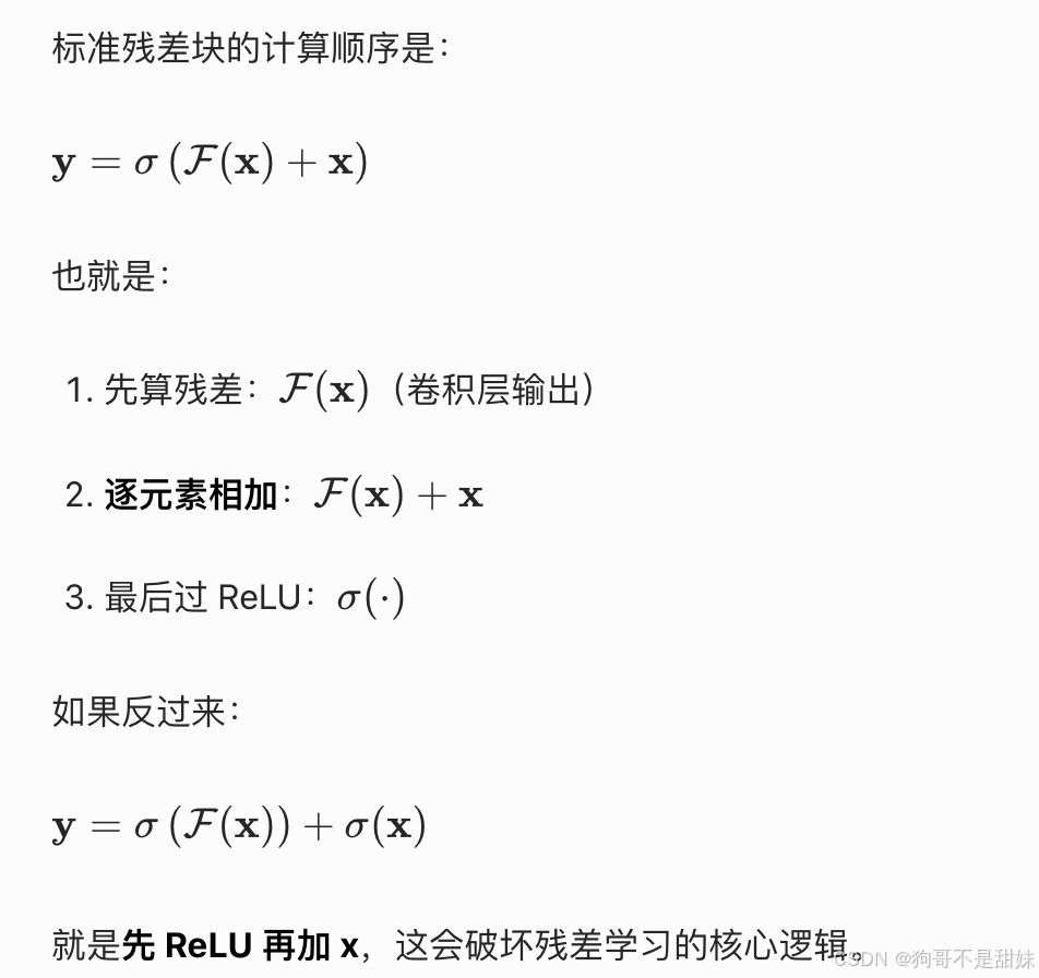 普通网络学的是「从输入到最终输出的完整映射」,ResNet 学的是「最终输出和原始输入的差值(残差)」