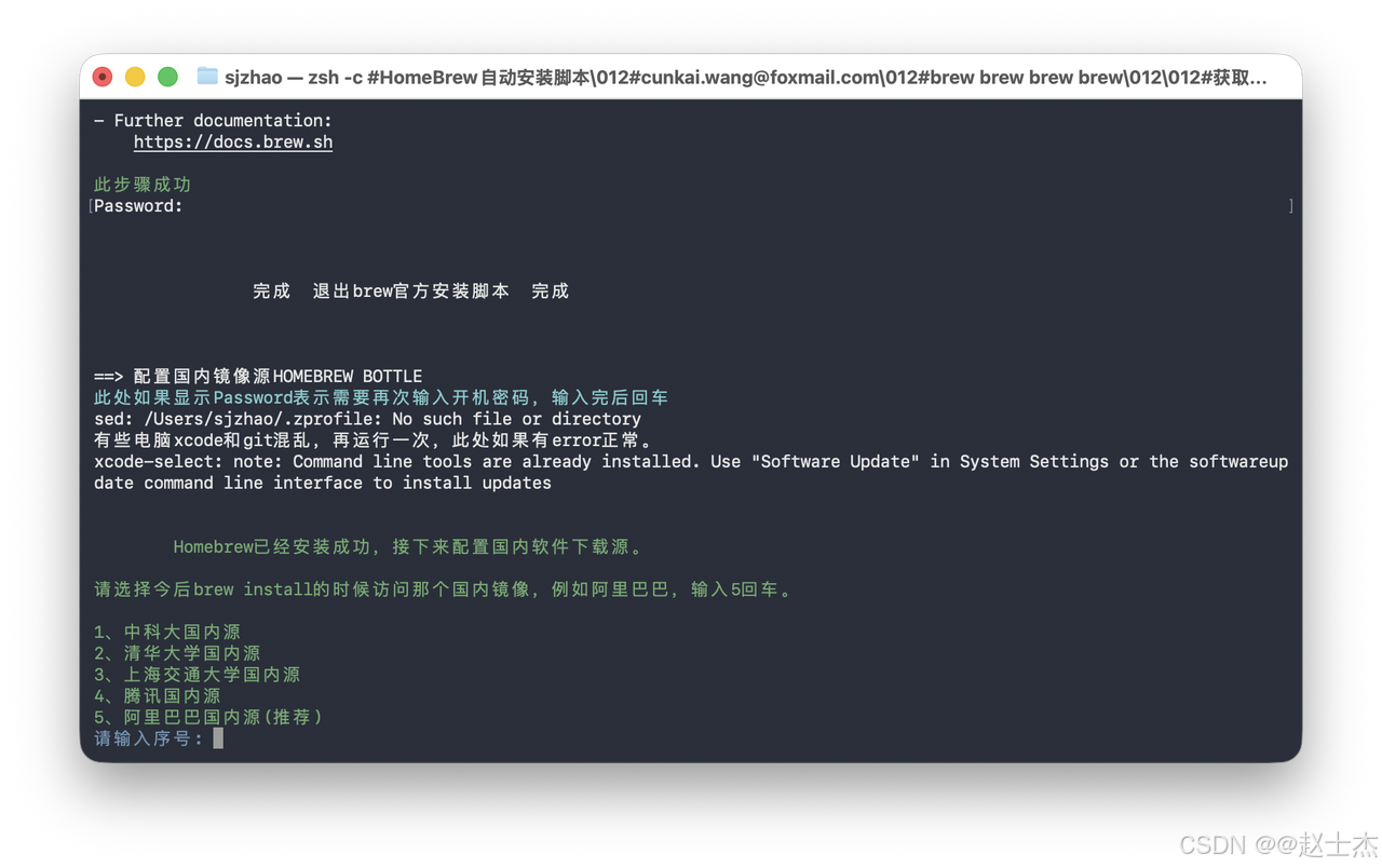 重启终端或者运行 source /Users/sjzhao/.zprofile让国内镜像源的配置立即生效。